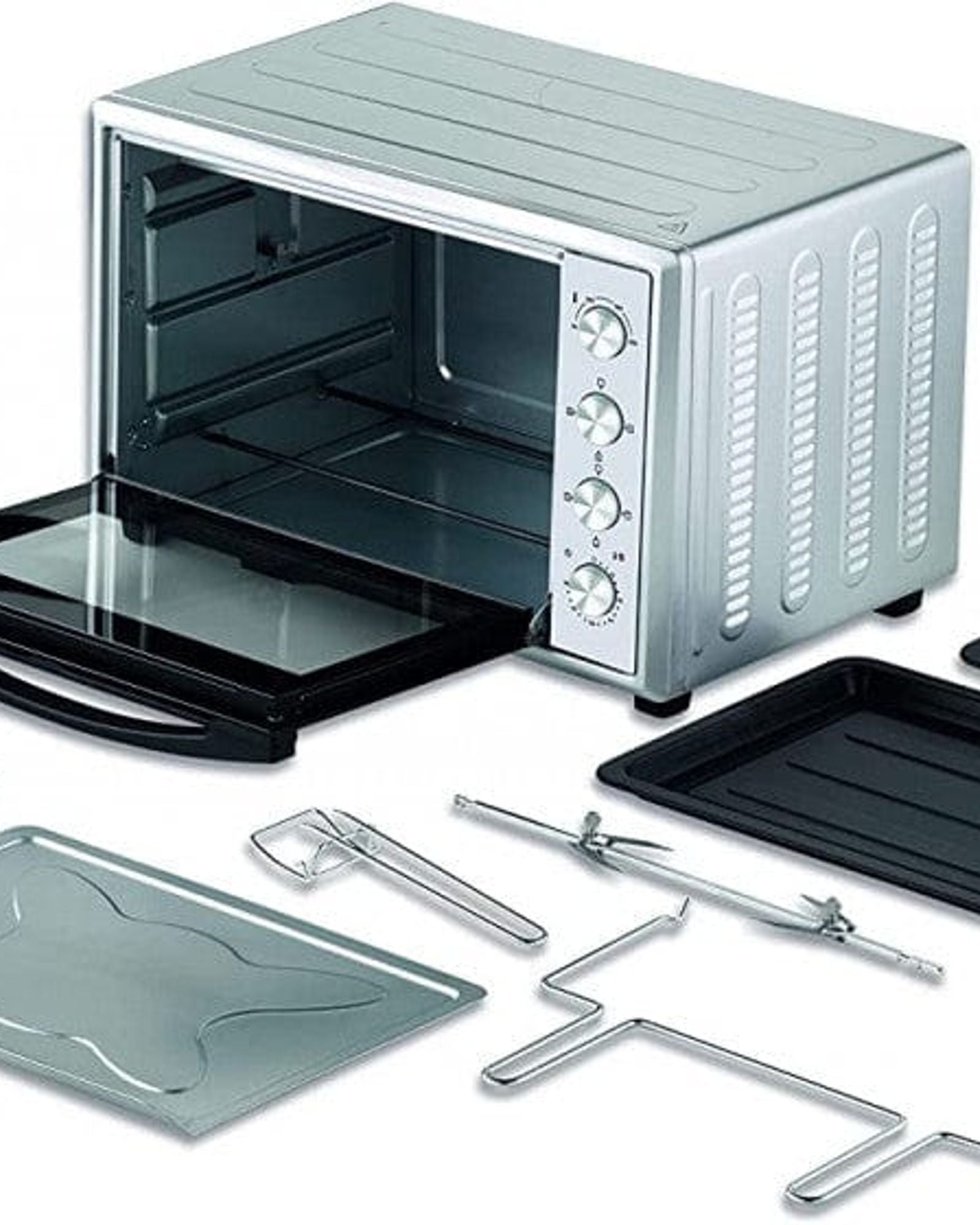 الملحقات: شواية، مقبض لإزالة الشواية، صينيتان للخبز من المينا، شواية دوارة، مقبض لإزالة الشواية، صينية فتات