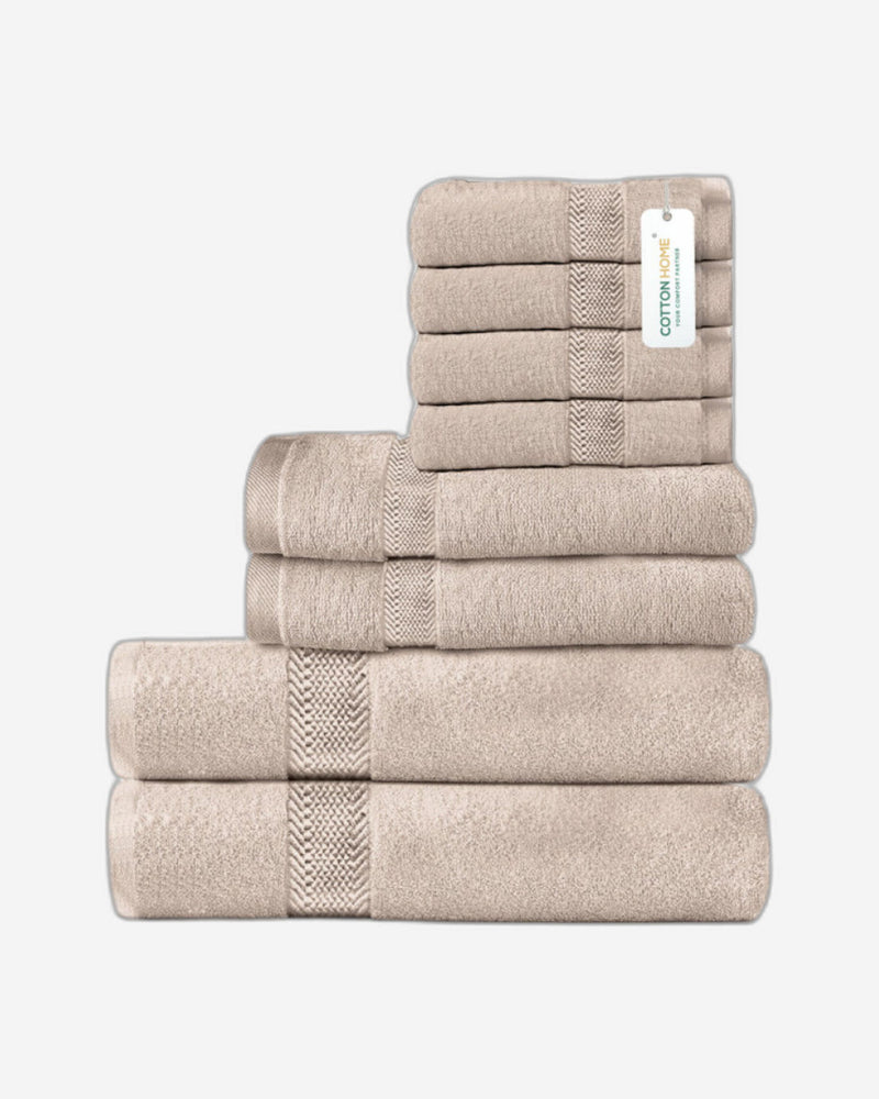طقم مناشف قطنية فاخرة من كوتون هوم، مكون من 8 قطع، مصمم بعناية فائقة ليجمع بين الفخامة والراحة والعملية لجميع أفراد الأسرة. يتضمن الطقم 4 مناشف وجه (30×30 سم)، ومنشفتي يد (40×70 سم)، ومنشفتي حمام (70×140 سم)، مما يجعله الحل الأمثل لاحتياجات الحمام اليومية. مصنوعة من قطن فاخر 100% بسمك 600 جرام لكل متر مربع، تتميز هذه المناشف بنعومتها الفائقة، وامتصاصها العالي، وجفافها السريع. يضمن نسيج المنشفة عالي الجودة ملمسًا ناعمًا يشبه المنتجعات الصحية، بينما يضمن تصميمها خفيف الوزن سهولة الاستخدام اليومي. سواءً في المنزل أو المنتجع الصحي أو في صالة الألعاب الرياضية، تتميز هذه المجموعة متعددة الاستخدامات بالمتانة والأناقة والقيمة الاستثنائية.