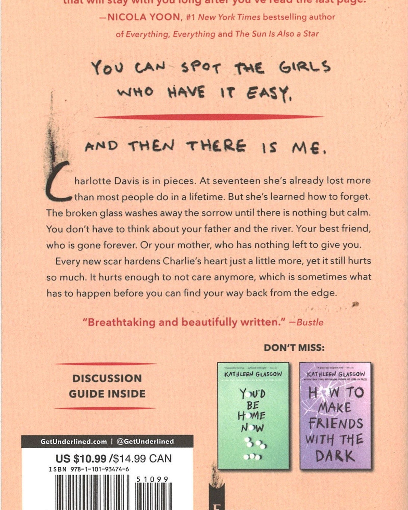 صورة مؤثرة لفتاة في عالمٍ لا يدين لها بشيء، وقد تحمل الكثير، ورحلة استعادة عافيتها. رواية كاثلين غلاسكو الأولى واقعيةٌ بشكلٍ مُفجع، وصادقةٌ بشكلٍ لا يلين. إنها قصةٌ لن تستطيع تجاهلها.