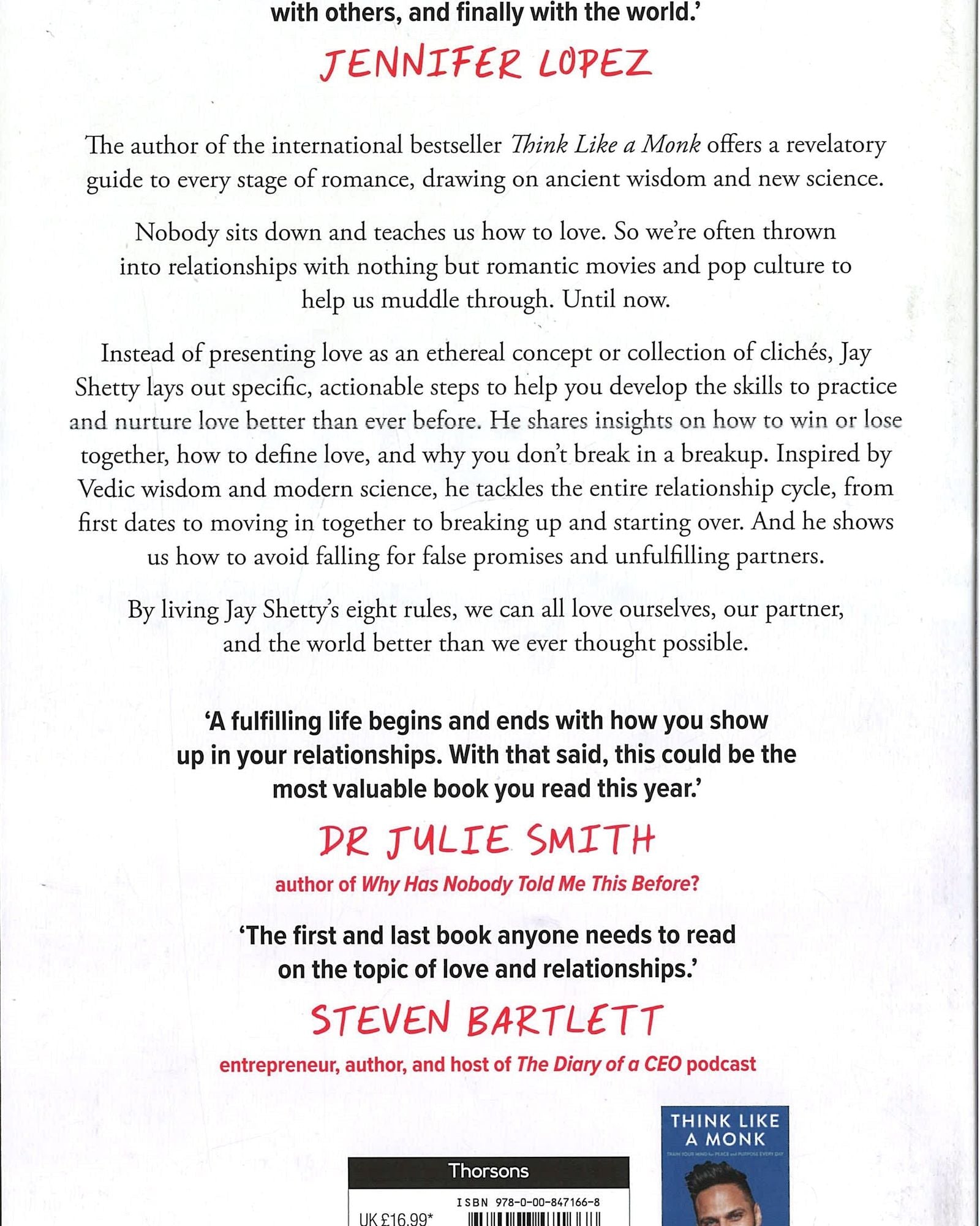 يقدم مؤلف كتاب "فكّر كالراهب" الأكثر مبيعًا في صحيفة صنداي تايمز، دليلًا كاشفًا لكل مرحلة من مراحل الحب، مستوحىً من الحكمة القديمة والعلم الحديث. لا أحد يُجلسنا ليُعلّمنا كيف نحب. لذلك غالبًا ما نُلقى في علاقات لا نجد فيها سوى أفلام الرومانسية وثقافة البوب لمساعدتنا على تجاوزها. حتى الآن. بدلًا من تقديم الحب كمفهوم أثيري أو مجموعة من الكليشيهات، يضع جاي شيتي خطوات محددة وعملية لمساعدتك على تطوير مهارات ممارسة الحب ورعايته بشكل أفضل من أي وقت مضى. يشاركنا أفكارًا حول كيفية الفوز أو الخسارة معًا، وكيفية تعريف الحب، ولماذا لا تنفصل في حالة الانفصال. مستوحىً من الحكمة الفيدية والعلم الحديث، يتناول دورة العلاقة بأكملها، من المواعيد الأولى إلى الانتقال للعيش معًا إلى الانفصال والبدء من جديد. ويوضح لنا كيفية تجنب الوقوع في فخ الوعود الكاذبة والشركاء غير المُرضين. باتباع قواعد جاي شيتي الثمانية، يمكننا جميعًا أن نحب أنفسنا وشريكنا والعالم بشكل أفضل مما كنا نعتقد.