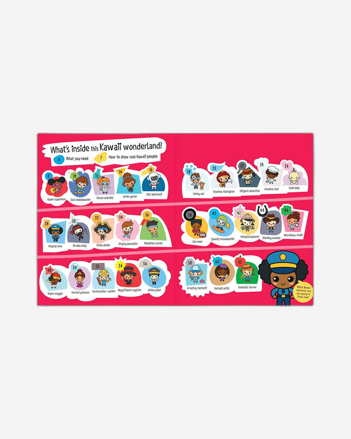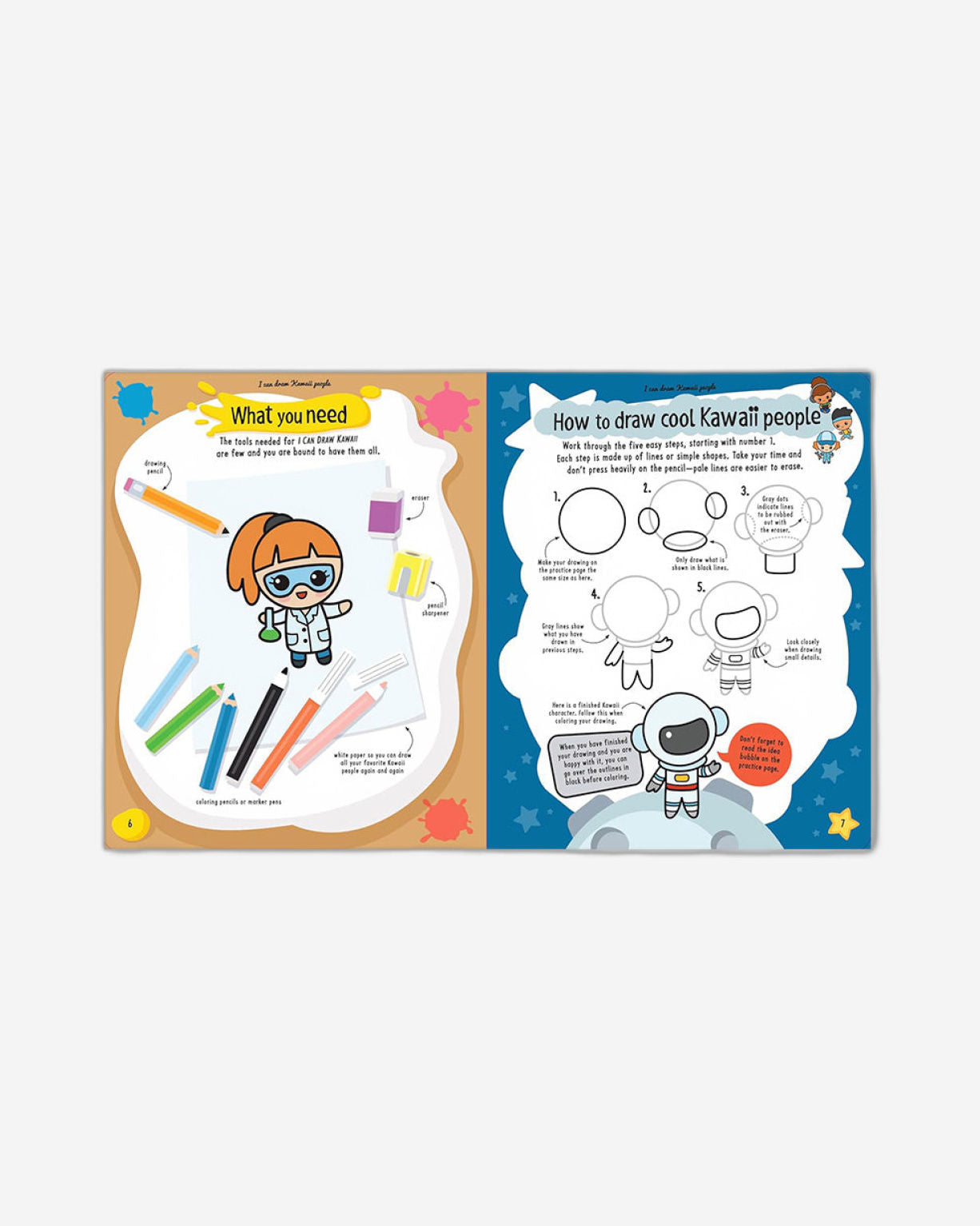 الفئة العمرية: ٧ سنوات فما فوق. هل يوجد في حياتكم أطفالٌ مولعونٌ بفن الكاواي حاليًا؟ سيكون هذا الكتاب مثاليًا لهم! تعلّموا كيفية رسم أكثر من ٢٥ شخصية كاواي رائعة وجذابة في خمس خطوات سهلة! استخدموا أقلام الرصاص، أو أقلام التحديد، أو أقلام الجل لإتقان تقنيات رسم شخصيات رائعة بتعبيرات فائقة الجمال! من طفلٍ لطيف، ومتزلج تزلج سريع، إلى نينجا رشيق، سترون اللطف يتدفق!