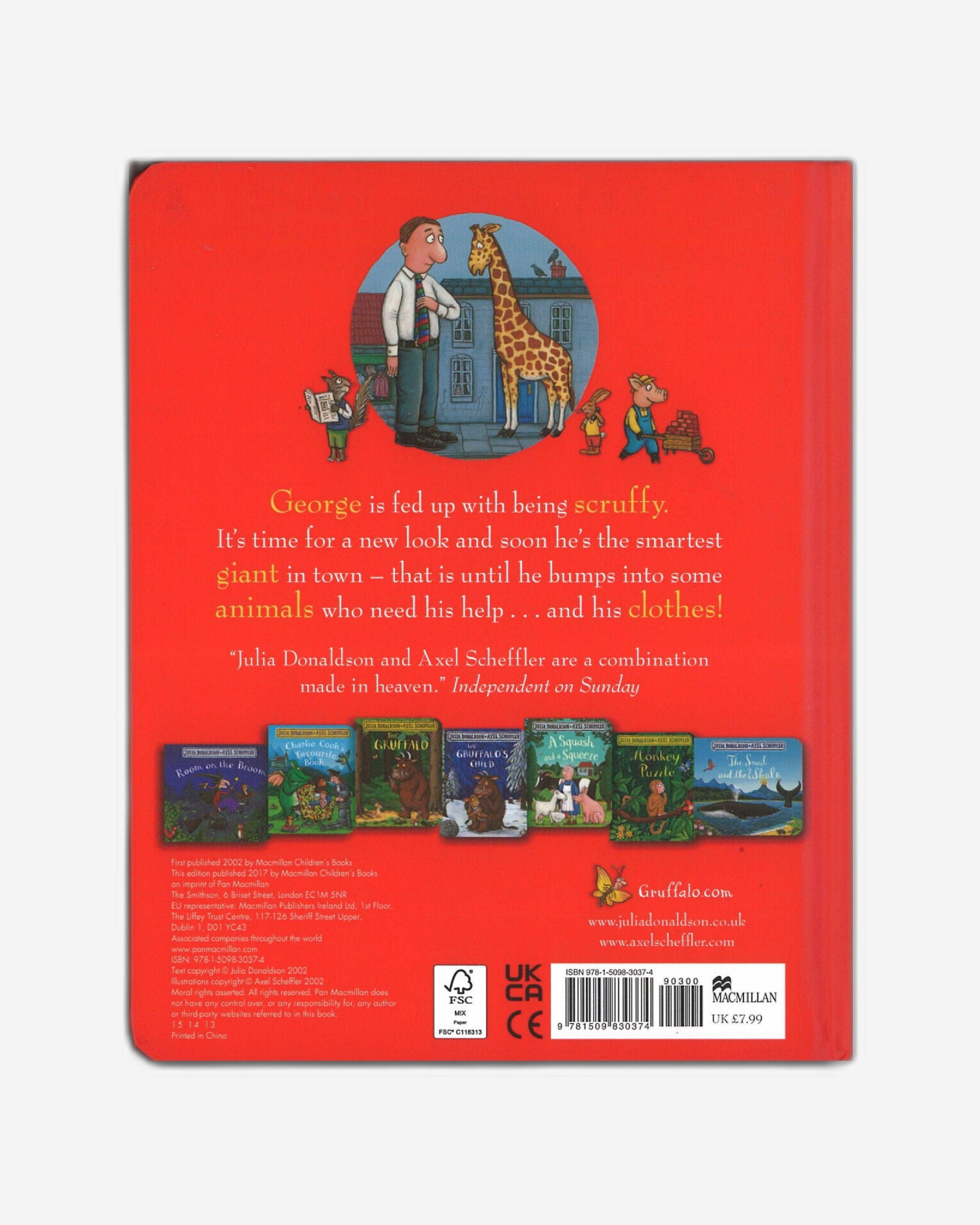 تمنى جورج لو لم يكن أذكى عملاق في المدينة. لذا، عندما رأى متجرًا جديدًا يبيع ملابس بمقاسات ضخمة، قرر أن الوقت قد حان لمظهر جديد: بنطال أنيق، قميص أنيق، ربطة عنق مخططة، حذاء لامع. الآن أصبح أذكى عملاق في المدينة... حتى صادف بعض الحيوانات التي تحتاج بشدة إلى مساعدته - وملابسه!
