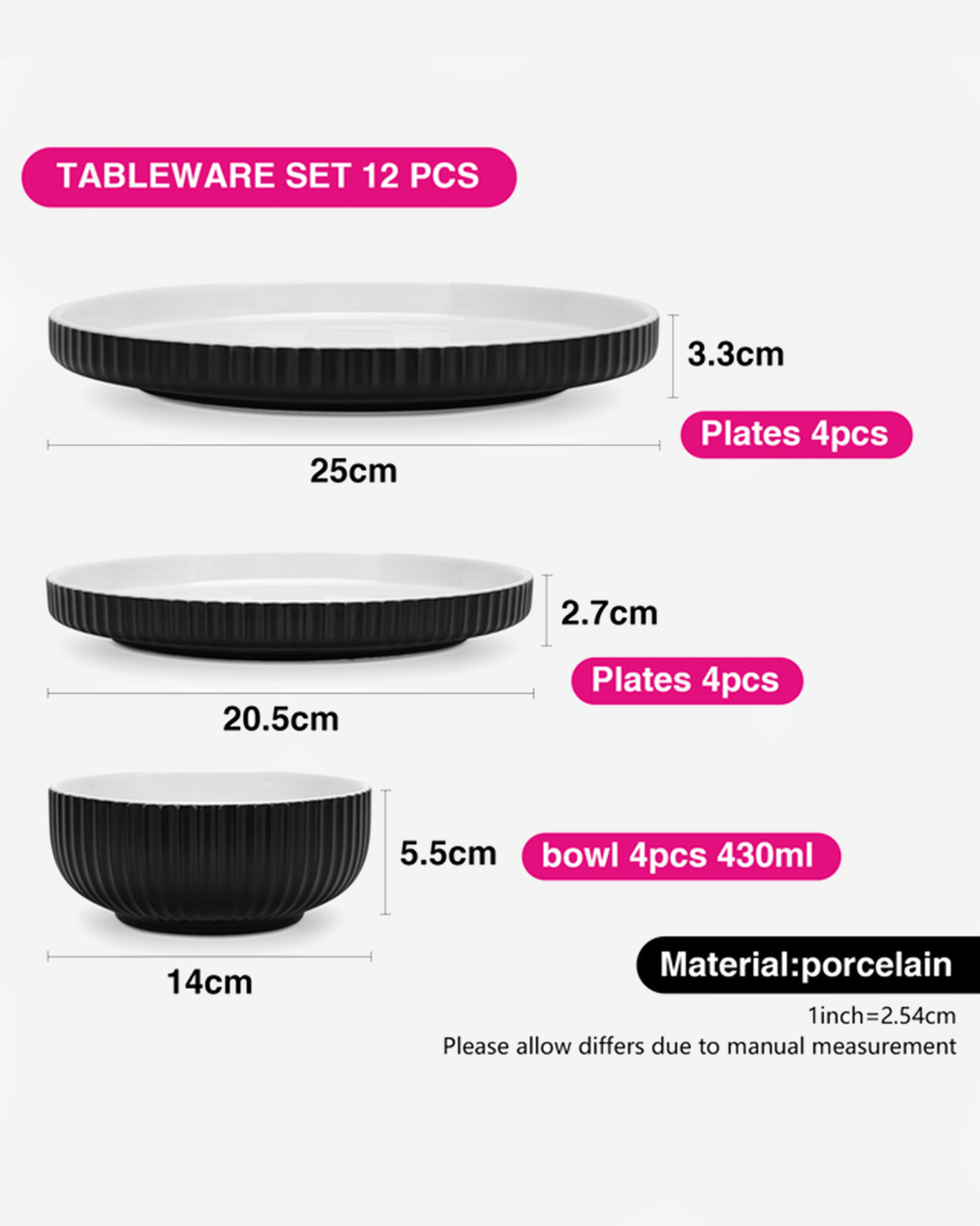 FISSMAN Tableware Set ONYX 12 pcs – Durable Porcelain (White & Black)