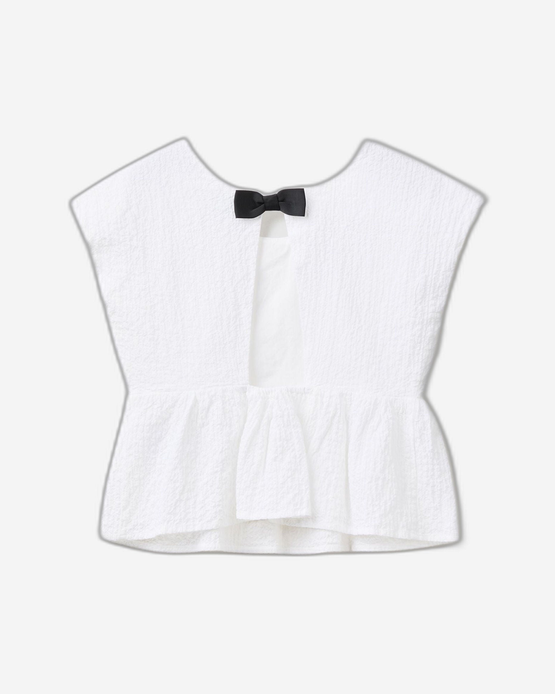 بلوزة مبطنة من القطن الخالص خفيف الوزن، مزينة بفيونكة بألوان متناسقة على الظهر. رقبة دائرية، أكمام قصيرة، وكشكشة من الأسفل. مثالية أيضًا للمناسبات الخاصة.