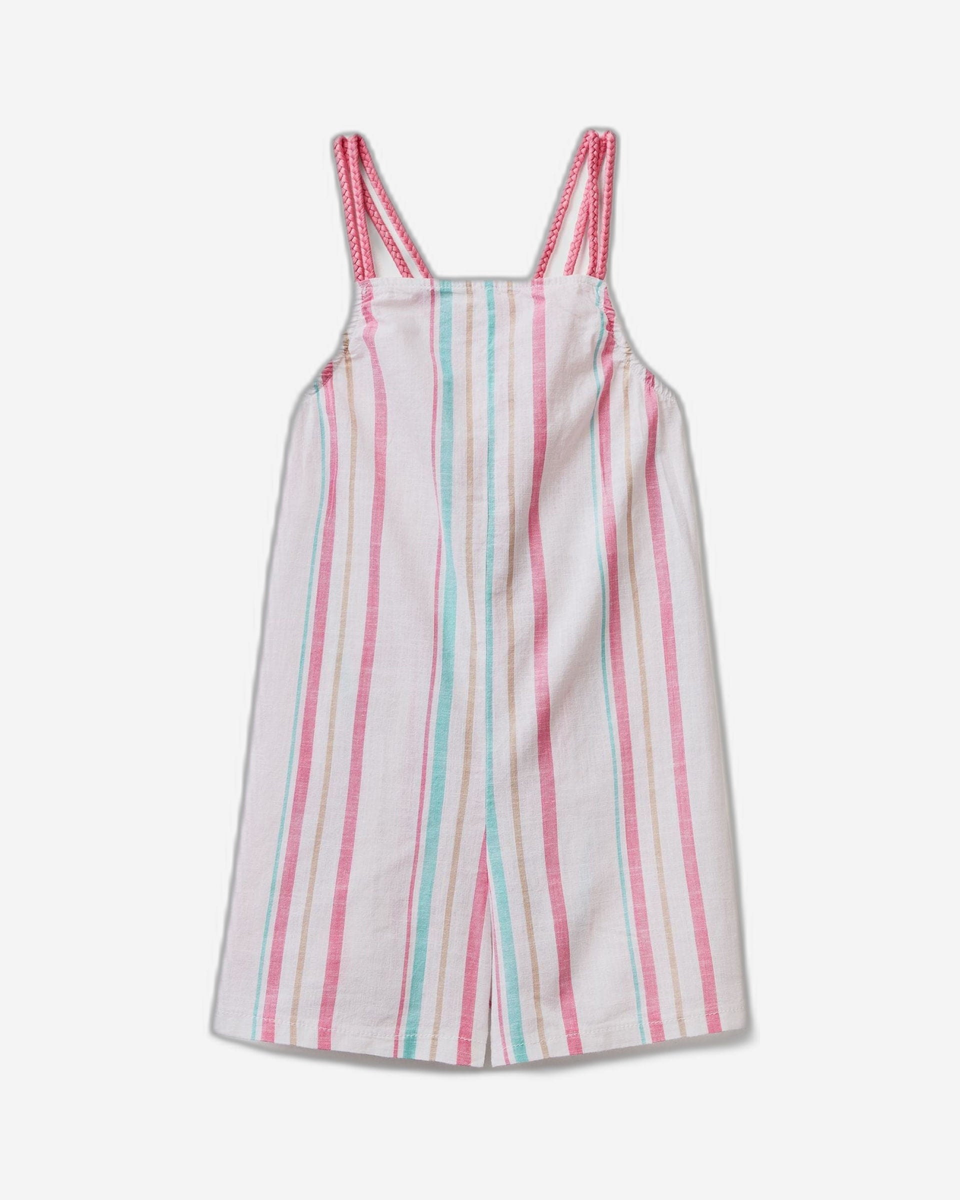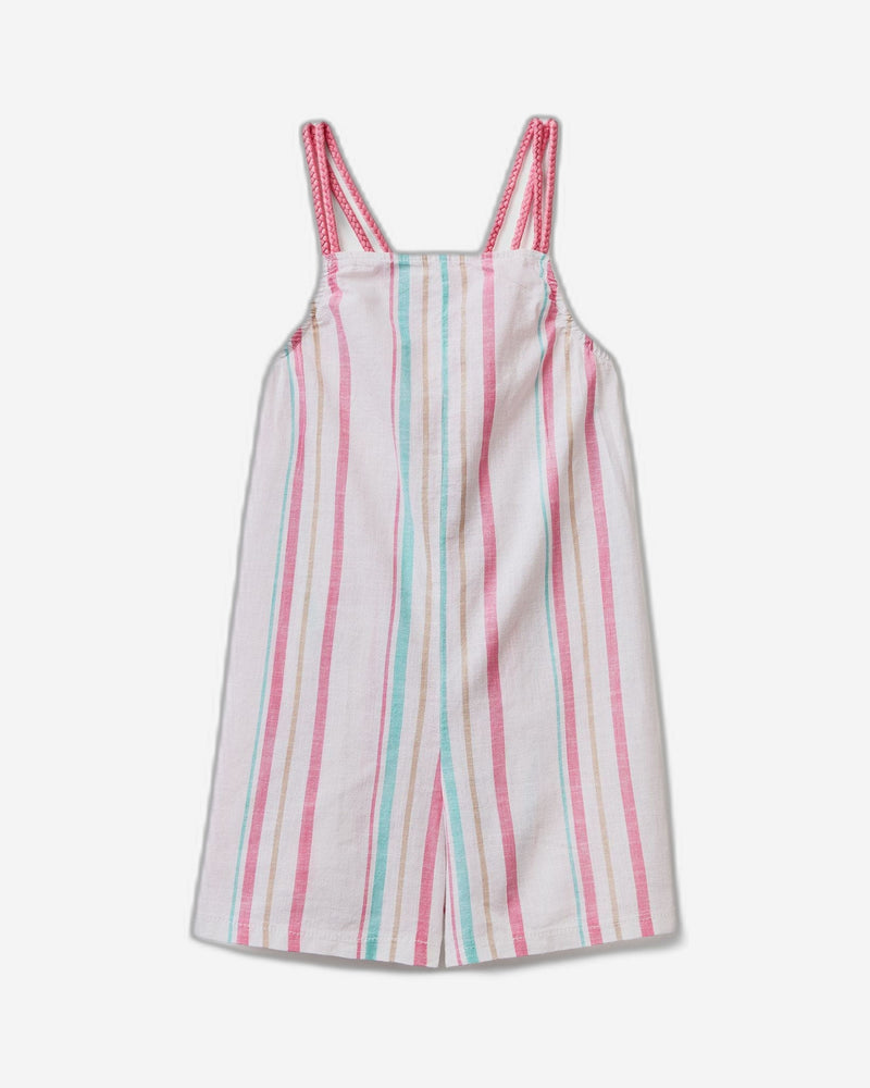 جمبسوت قصير بدون أكمام من القطن الخالص، مزين بخطوط عمودية متعددة الألوان مصبوغة بخيوط مصبوغة. قصة مريحة، بطول يصل إلى منتصف الفخذ، وحمالات كتف رفيعة متقاطعة من الخلف. لإطلالة أنيقة ومنعشة.