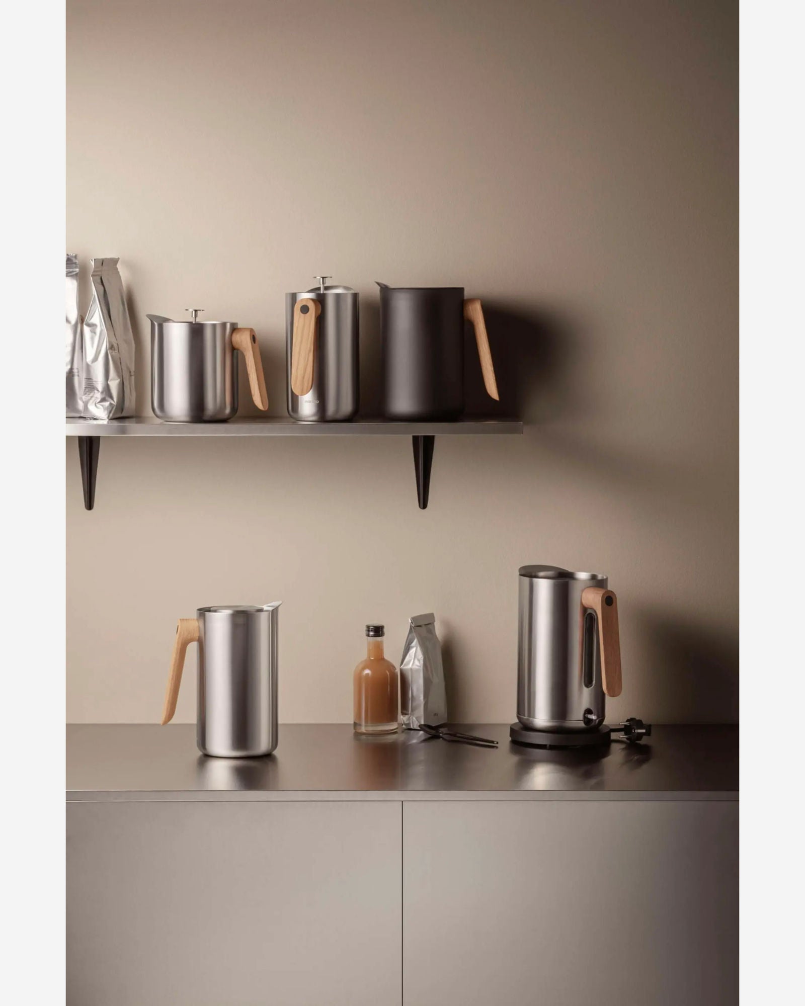 تصميم إسكندنافي خالد مع وظائف استثنائية. مصنوع من الفولاذ المقاوم للصدأ المصقول ومقبض من خشب البلوط الطبيعي، يضمن هذا الإبريق سعة 1 لتر بقاء مشروباتك في درجة الحرارة المثالية، مما يجعله إضافة أنيقة لأي مطبخ عصري.