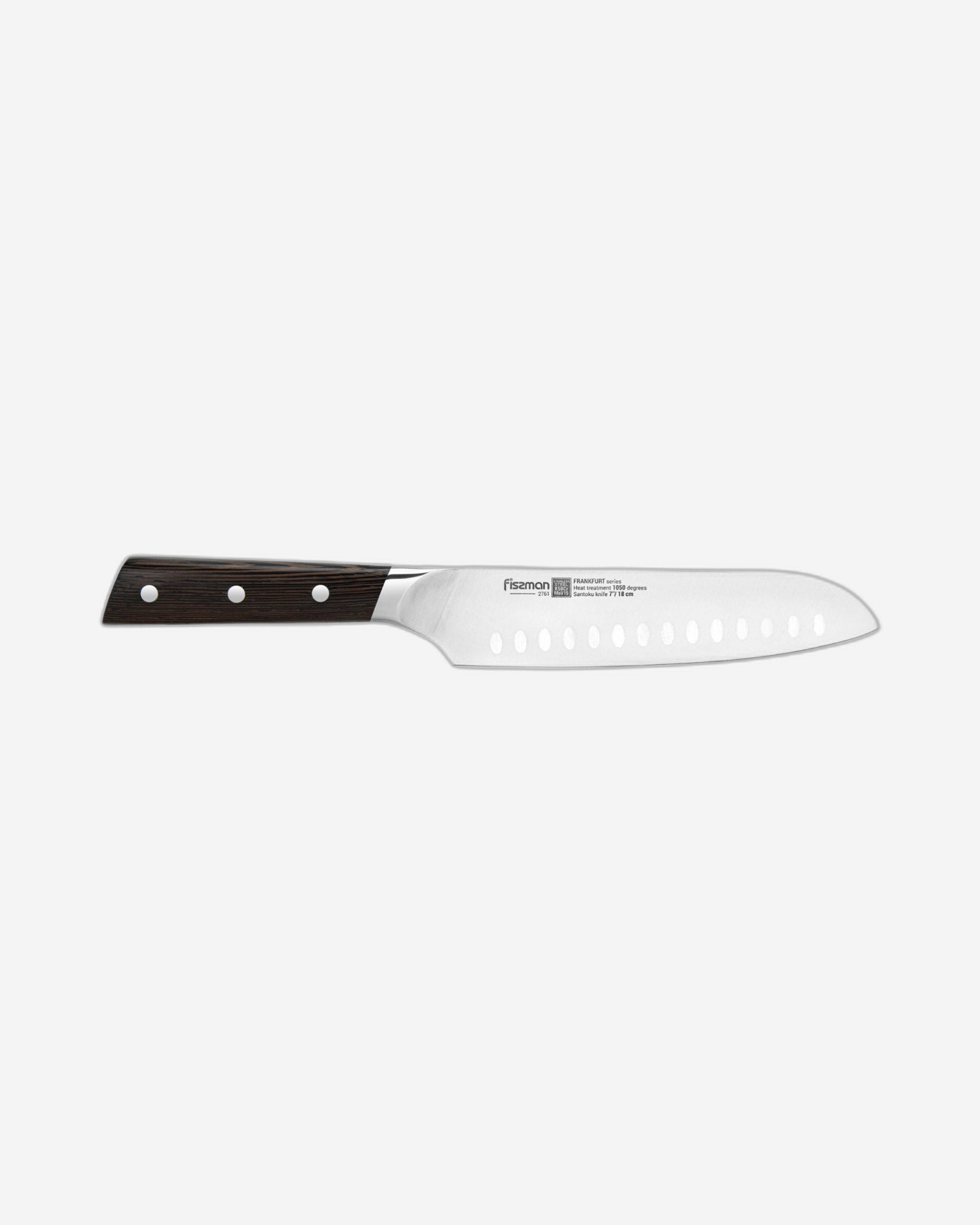 سانتوكو سكين ياباني تقليدي. تعني الكلمة نفسها "الفضائل الثلاث" باللغة اليابانية، في إشارة إلى المهام التي يؤديها هذا السكين: التقطيع، والتقطيع، والتقطيع. يشبه في مظهره سكين الطاهي الكبير، ولكنه يتميز بشكل مميز بطرف منحني وشفرة مستقيمة، تُسمى غالبًا "قدم الخروف". يسمح هذا الشكل بحركة أعلى وأسفل أكثر دقة عند التقطيع، مما يجعله أكثر كفاءة ودقة من الحركة ذهابًا وإيابًا عند استخدام سكين الطاهي. عادةً ما تحتوي سكاكين سانتوكو على شق على الشفرة يُسمى "غرانتون". تساعد هذه الأخاديد على تقليل الاحتكاك ومنع التصاق الطعام بالشفرة أثناء التقطيع. جميع سكاكين سلسلة فرانكفورت مصنوعة من الفولاذ الألماني عالي الجودة X50Cr15MoV، المعروف بخصائصه الميكانيكية الممتازة، ومتانته وصلابته (HRC 55 HRC) ومقاومته للتآكل، وقادر على الحفاظ على قطع ممتاز لفترة طويلة. شحذ أوروبي كلاسيكي، متناسق على طول حافة القطع، يوفر سهولة استخدام مذهلة. يتميز المقبض الأنيق المصنوع من خشب وينج الأفريقي بتصميمه المريح وقبضته المريحة. صُنعت هذه السكاكين وفقًا للمعايير الاحترافية، وهي متينة ومتوازنة لتدوم طويلًا. ستساعدك فيسمان على تحقيق أفكارك الجريئة في المطبخ! فطور خفيف، غداء دسم، وعشاء شهي - ستساعدك فيسمان على تحقيق أي فكرة!