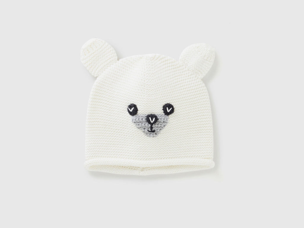 قبعة تريكو من مزيج القطن مع تطريزات كروشيه مرحة. وجه حيوان مطرز من الأمام وآذان من الأعلى. أنيقة وجذابة.