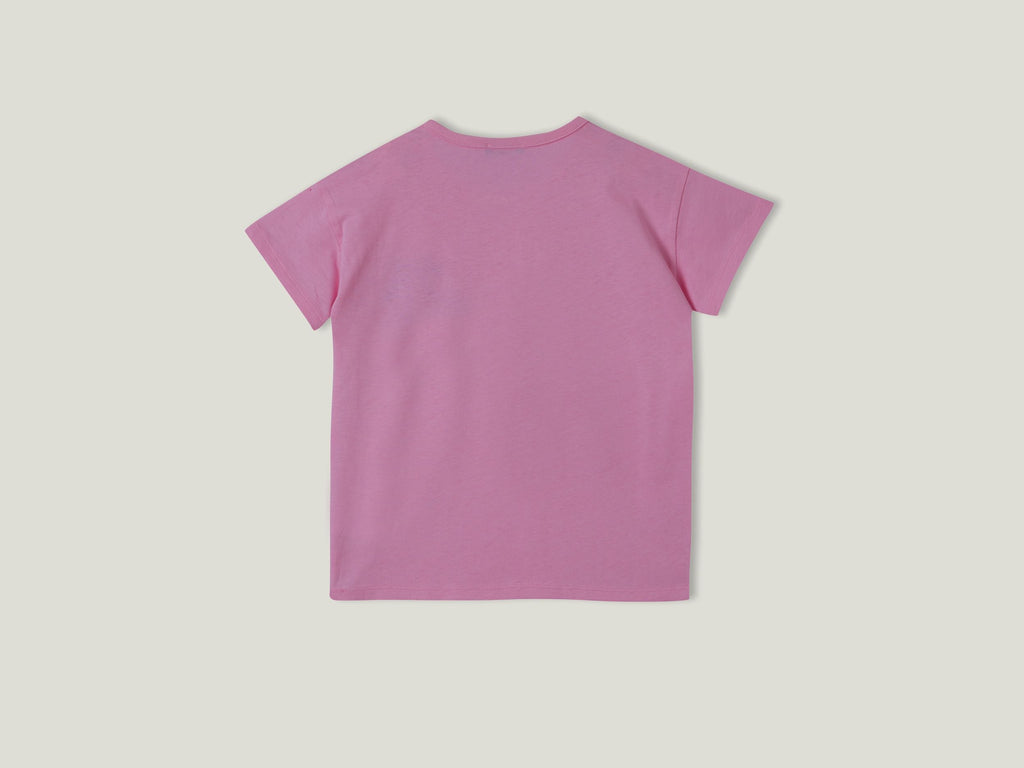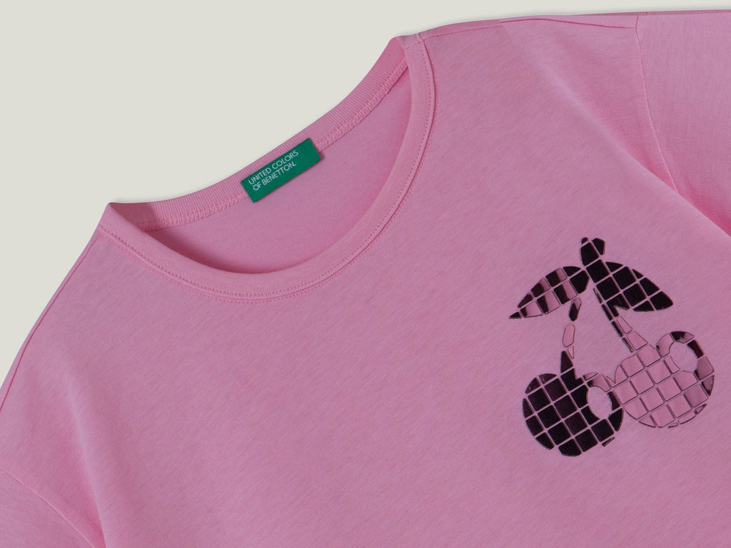 تيشيرت قطني خالص بأكمام قصيرة وياقة دائرية. تصميم مربع الشكل مع تطريز عاكس على الجهة الأمامية. لمسة من الإشراق لنزهاتها.