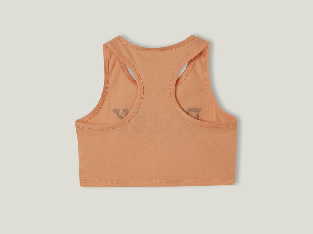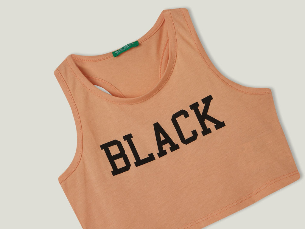 بلوزة قصيرة بدون أكمام من القطن الخالص. أكتاف عريضة وظهر بتصميم رياضي، مع أسماء ألوان مطبوعة على المقدمة. تصميم بسيط وعصري.