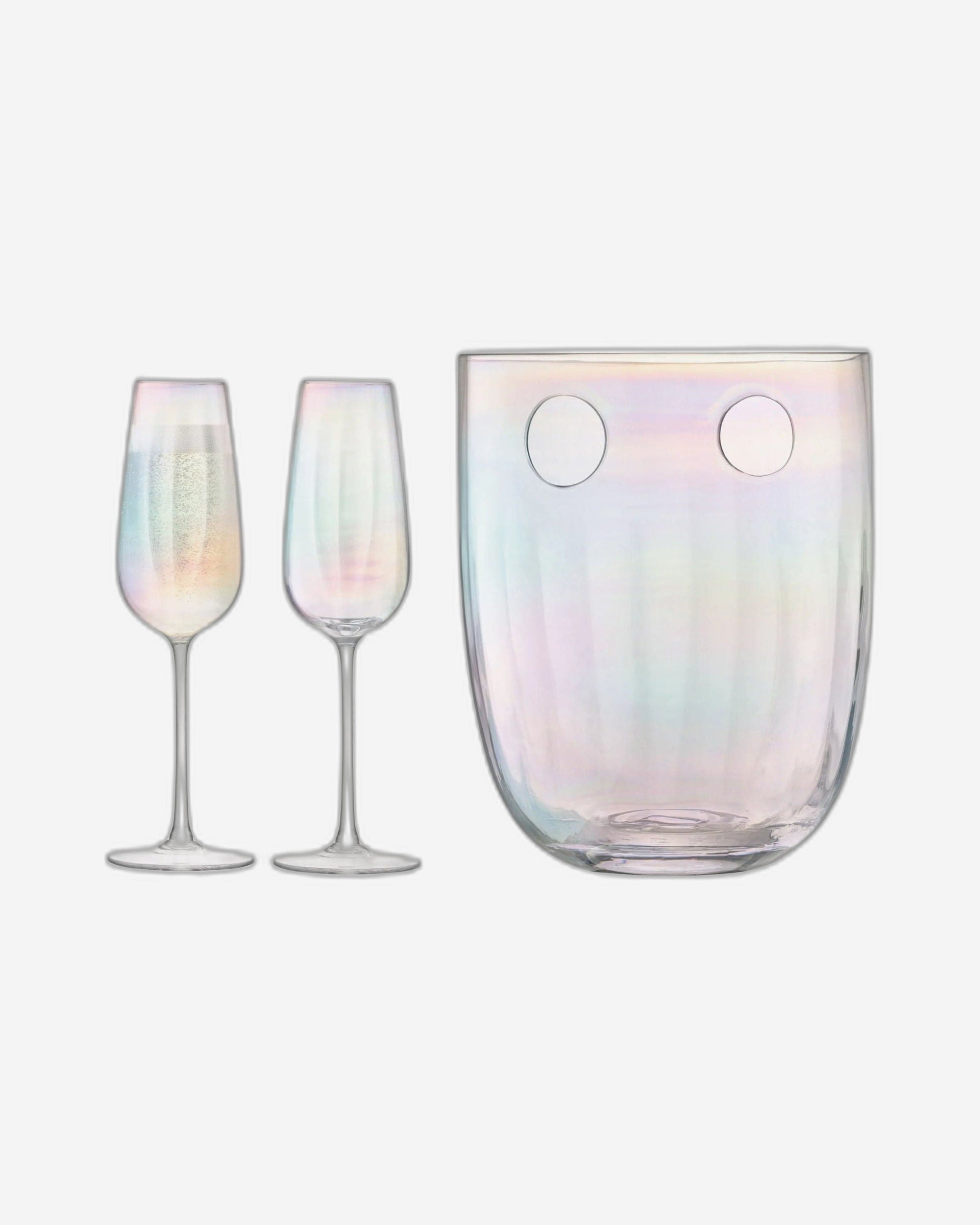 طقم شمبانيا لشخصين، مستوحى من بريق اللؤلؤة البراق. كؤوس الشمبانيا والدلو منفوخان بالفم لخلق ملمس مزخرف بدقة، ومطليان يدويًا ببريق عرق اللؤلؤ الشفاف.
