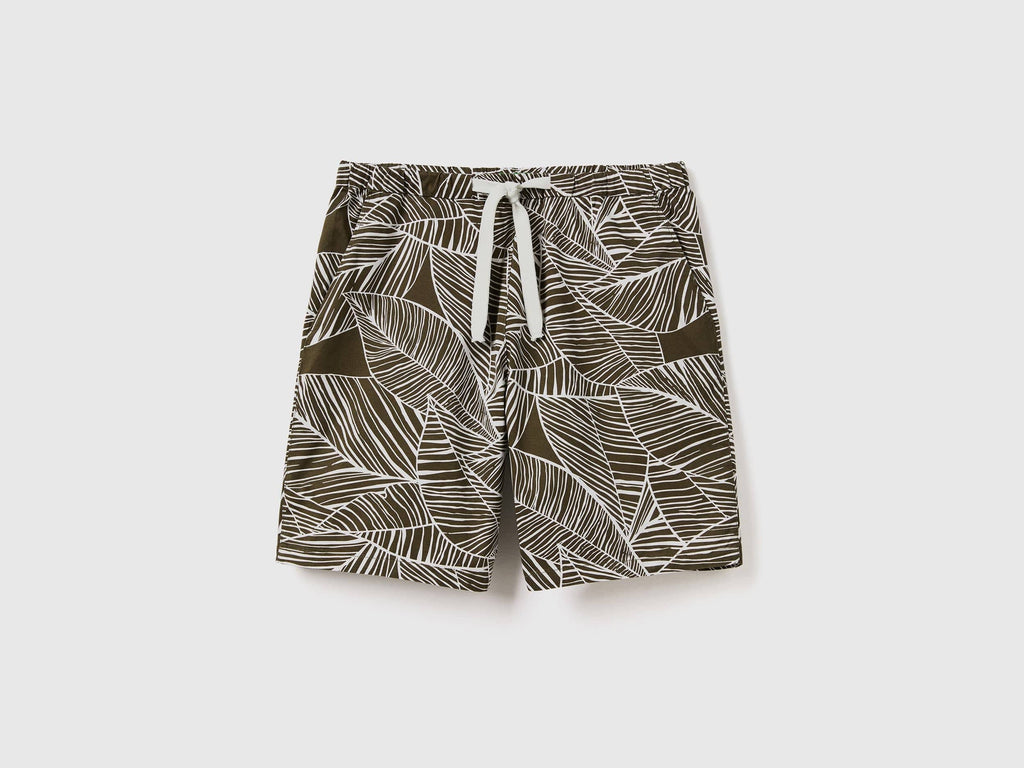 شورت من القطن الخالص، بحزام خصر مطاطي داخلي ورباط. جيوب جانبية وجيب خلفي صغير. طبعة استوائية شاملة بروح العطلة.