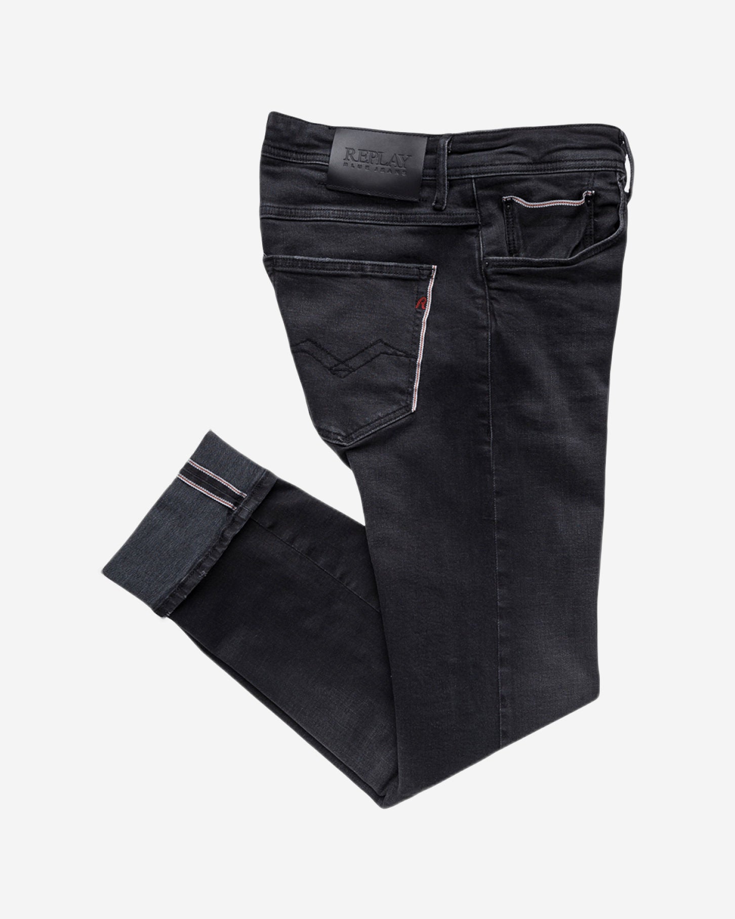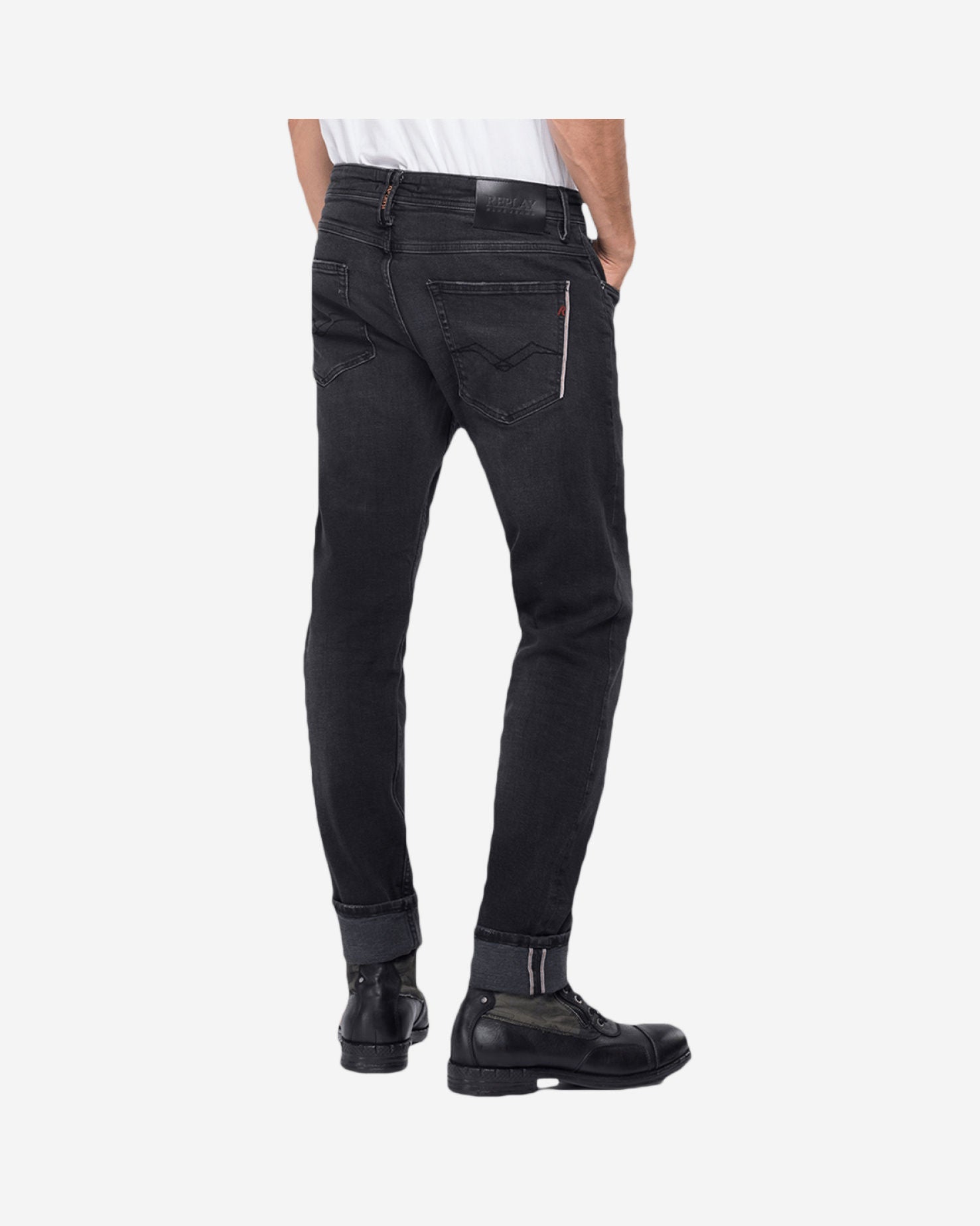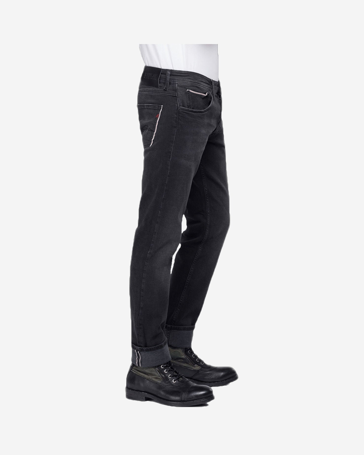 بنطلون جينز رجالي بقصّة "سليم فيت" من قماش الدنيم الأسود المرن ذو الحواف، وزن 10 أونصات، بلون داكن، يتميز بخصر عادي وساق رفيعة، وشوارب وخدوش يدوية، ومسحات قديمة على المناطق المستخدمة باستخدام مواد تبييض صديقة للبيئة، وتجفيف نهائي على مانيكان ثلاثي الأبعاد، وخمسة جيوب، وتفاصيل حواف بلون متباين على جيب العملات المعدنية والجيب الخلفي الأيمن، وعلامة "ريبلاي" مثلثة الشكل على الجيب الأيسر، وجيوب خلفية بخياطة "جول" الشهيرة، وعلامة شعار على ظهر حزام الخصر، وتطريز على شكل حرف R على الجيب الخلفي، وفتحة أزرار. الخامة الخارجية: 97% قطن، 2% إيلاستان، 1% بوليستر.
