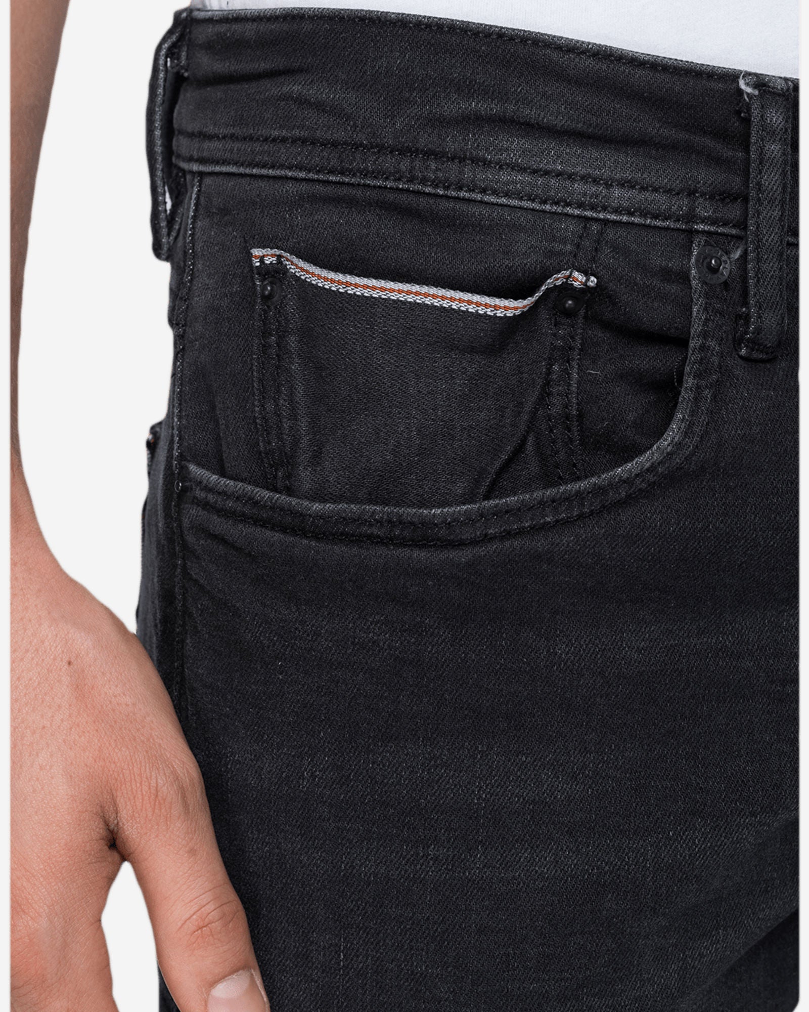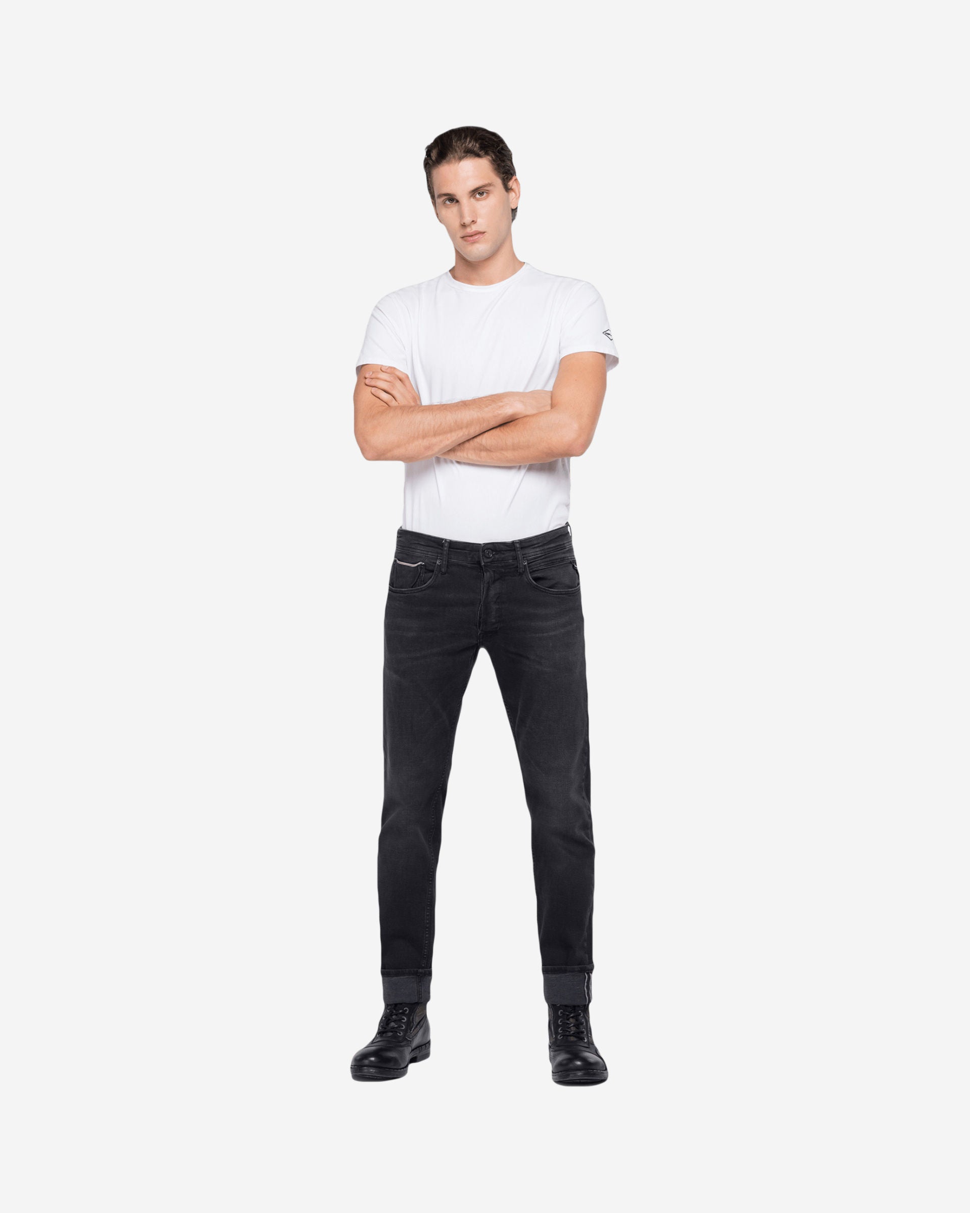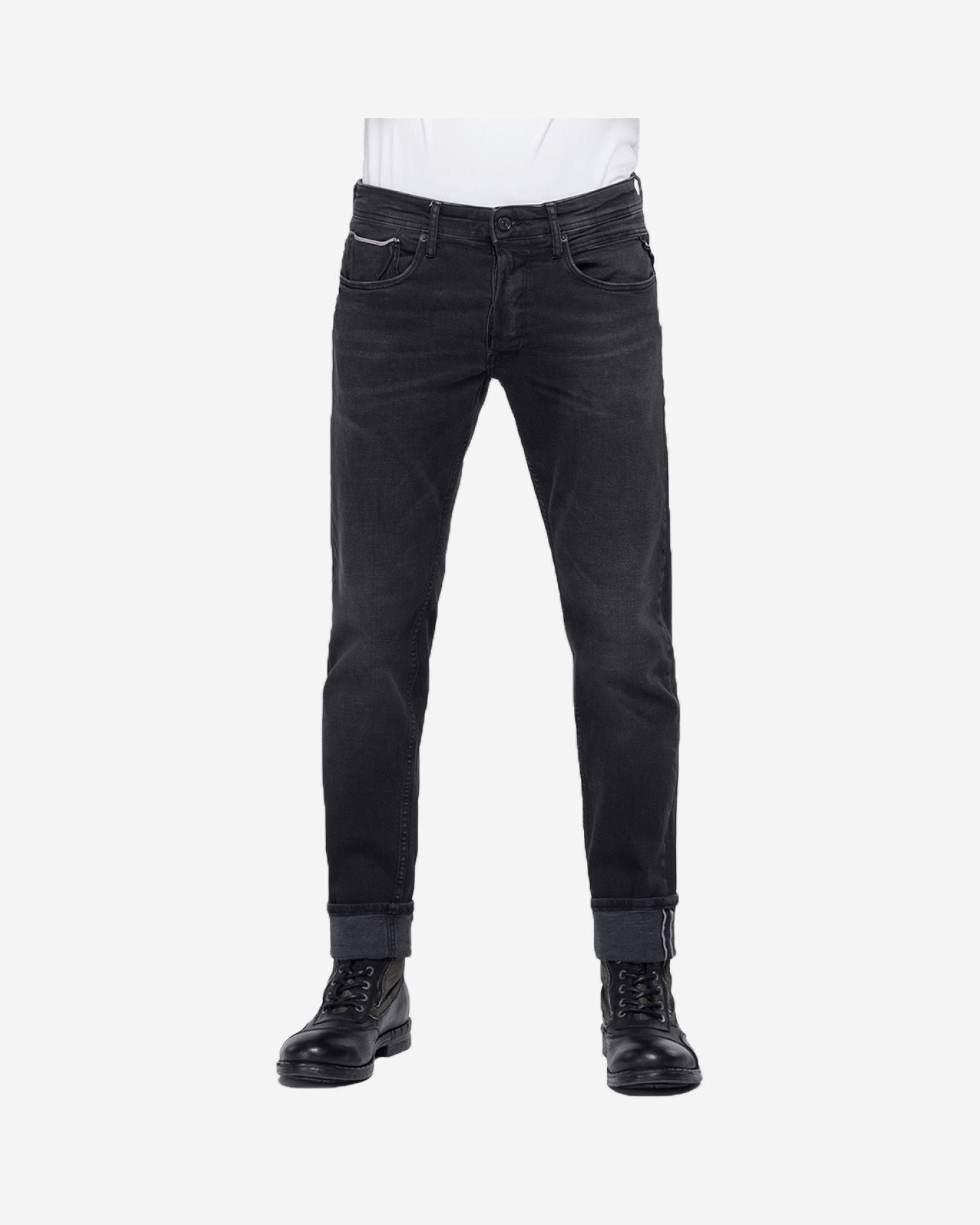 بنطلون جينز رجالي بقصّة "سليم فيت" من قماش الدنيم الأسود المرن ذو الحواف، وزن 10 أونصات، بلون داكن، يتميز بخصر عادي وساق رفيعة، وشوارب وخدوش يدوية، ومسحات قديمة على المناطق المستخدمة باستخدام مواد تبييض صديقة للبيئة، وتجفيف نهائي على مانيكان ثلاثي الأبعاد، وخمسة جيوب، وتفاصيل حواف بلون متباين على جيب العملات المعدنية والجيب الخلفي الأيمن، وعلامة "ريبلاي" مثلثة الشكل على الجيب الأيسر، وجيوب خلفية بخياطة "جول" الشهيرة، وعلامة شعار على ظهر حزام الخصر، وتطريز على شكل حرف R على الجيب الخلفي، وفتحة أزرار. الخامة الخارجية: 97% قطن، 2% إيلاستان، 1% بوليستر.