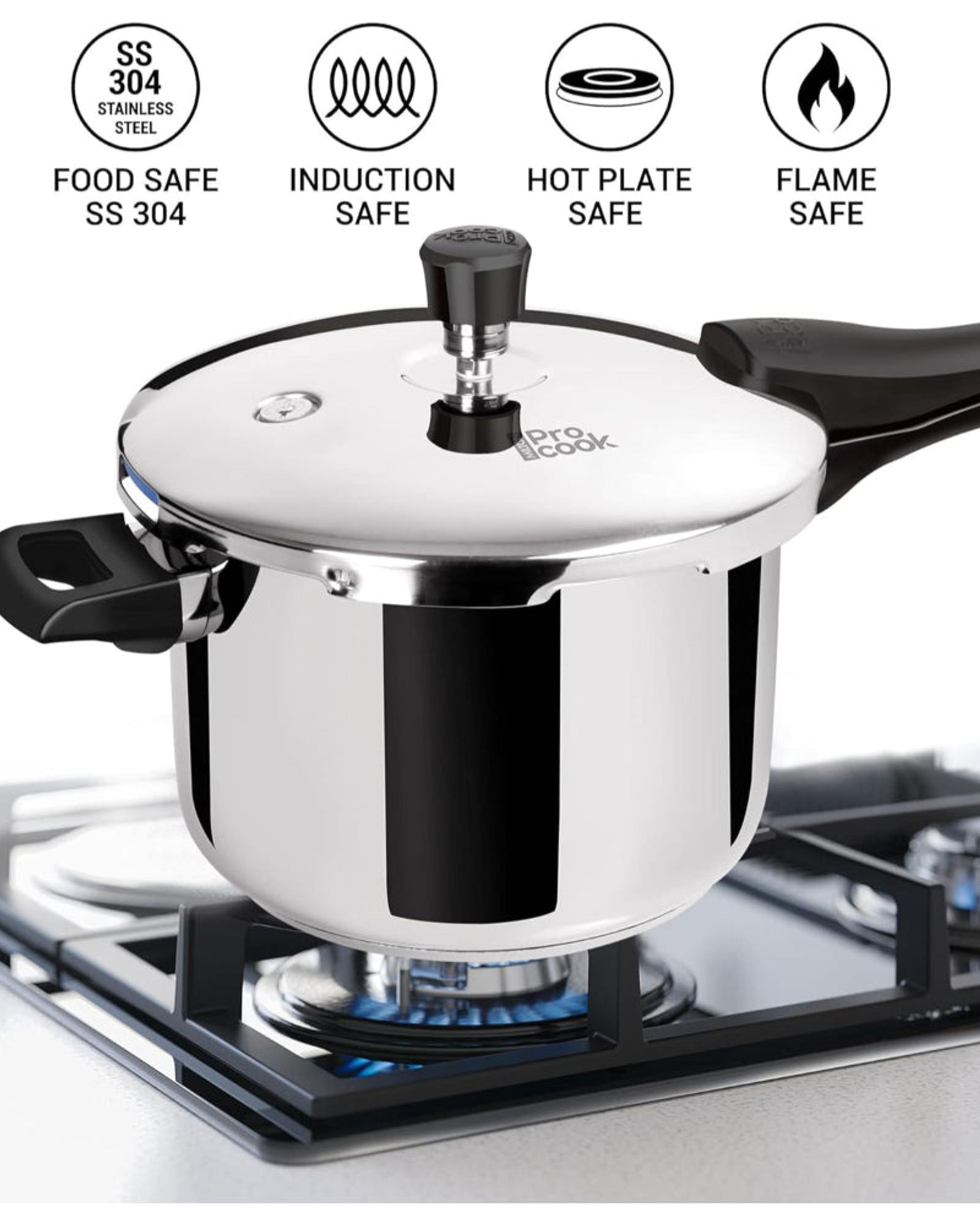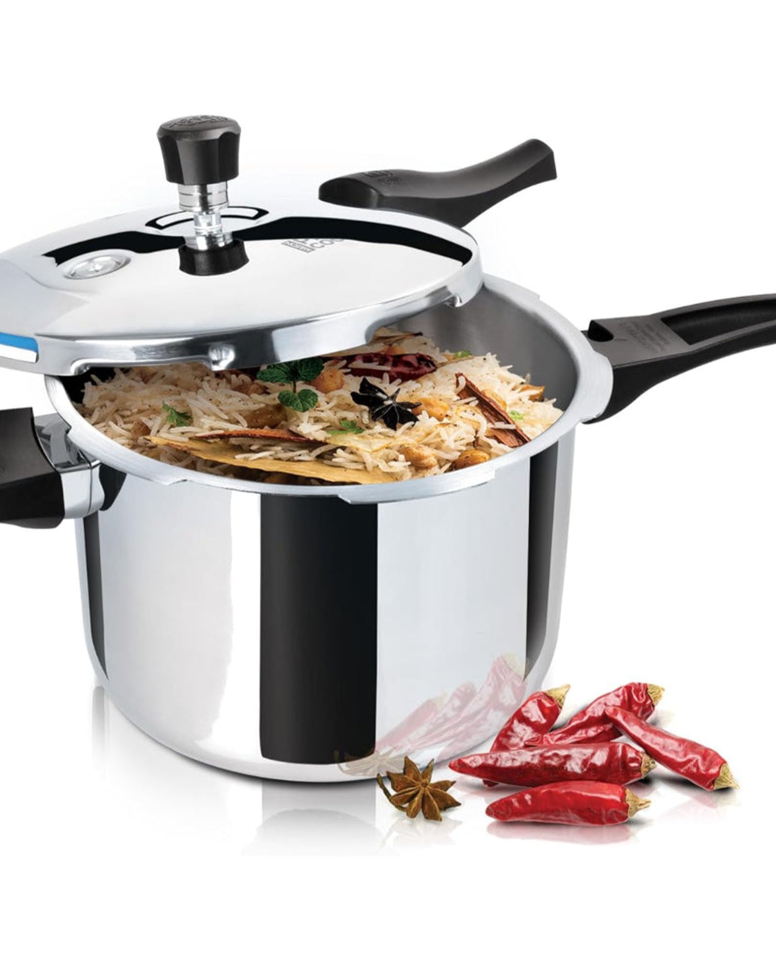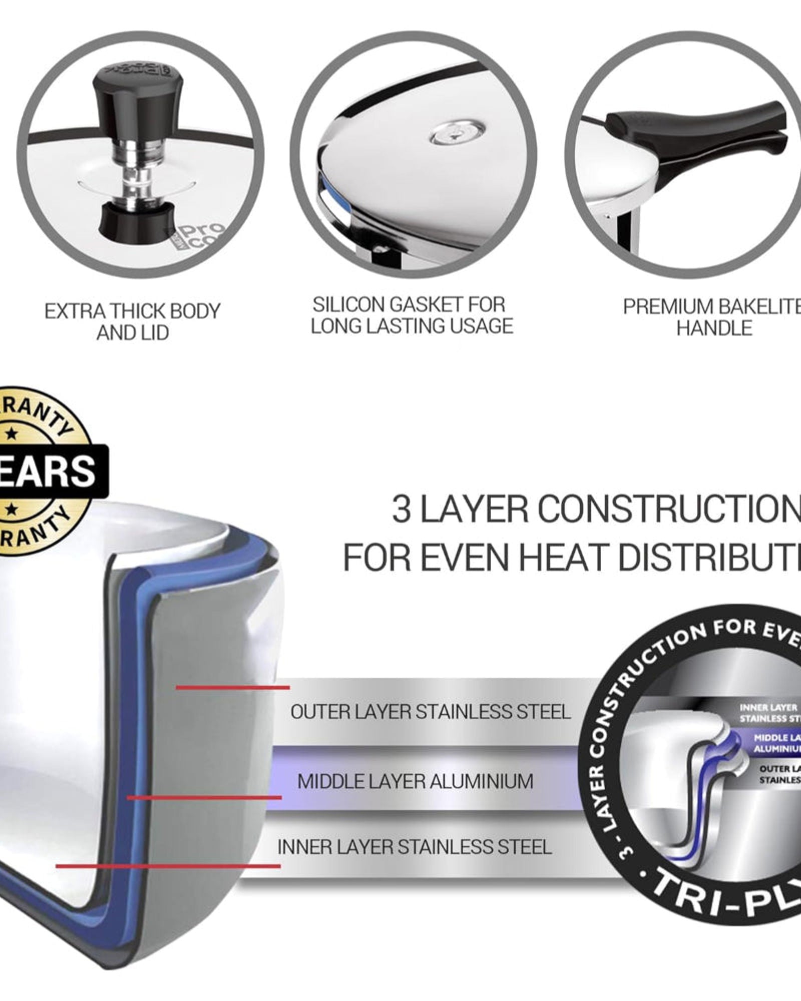 نقدم لكم طنجرة ضغط ميلتون برو كوك ثلاثية الطبقات، المصنوعة من الفولاذ المقاوم للصدأ، والمنحنية، والمزودة بقاعدة حثية، مع غطاء خارجي وغطاء زجاجي. طنجرة الضغط برو كوك مصنوعة من فولاذ SS304 عالي الجودة. تتميز بقاعدة حثية سميكة لتوزيع الحرارة بالتساوي. الجزء الداخلي من الطنجرة مطلي بطبقة نهائية غير لامعة، بينما يتميز الجزء الخارجي بلمعان فائق. إنها مناسبة للطهي على مواقد الحث والسيراميك والغاز. يُخفف وزن فتحة التهوية الضغط الزائد أثناء الاستخدام. الغطاء مزود بصمام أمان مؤكسد صلب. مقبض الطنجرة مصنوع من فولاذ SS304. مقابض الباكليت مصممة هندسيًا لتسهيل فتح الطنجرة وإغلاقها. كما أنها مزودة بصمام أمان تقليدي مع نظام تحرير الحشية. يمكنك طهي جميع مأكولاتك الشهية مثل السابجي والباف باجي والحلوى والكاري وغيرها الكثير في طنجرة الضغط هذه.