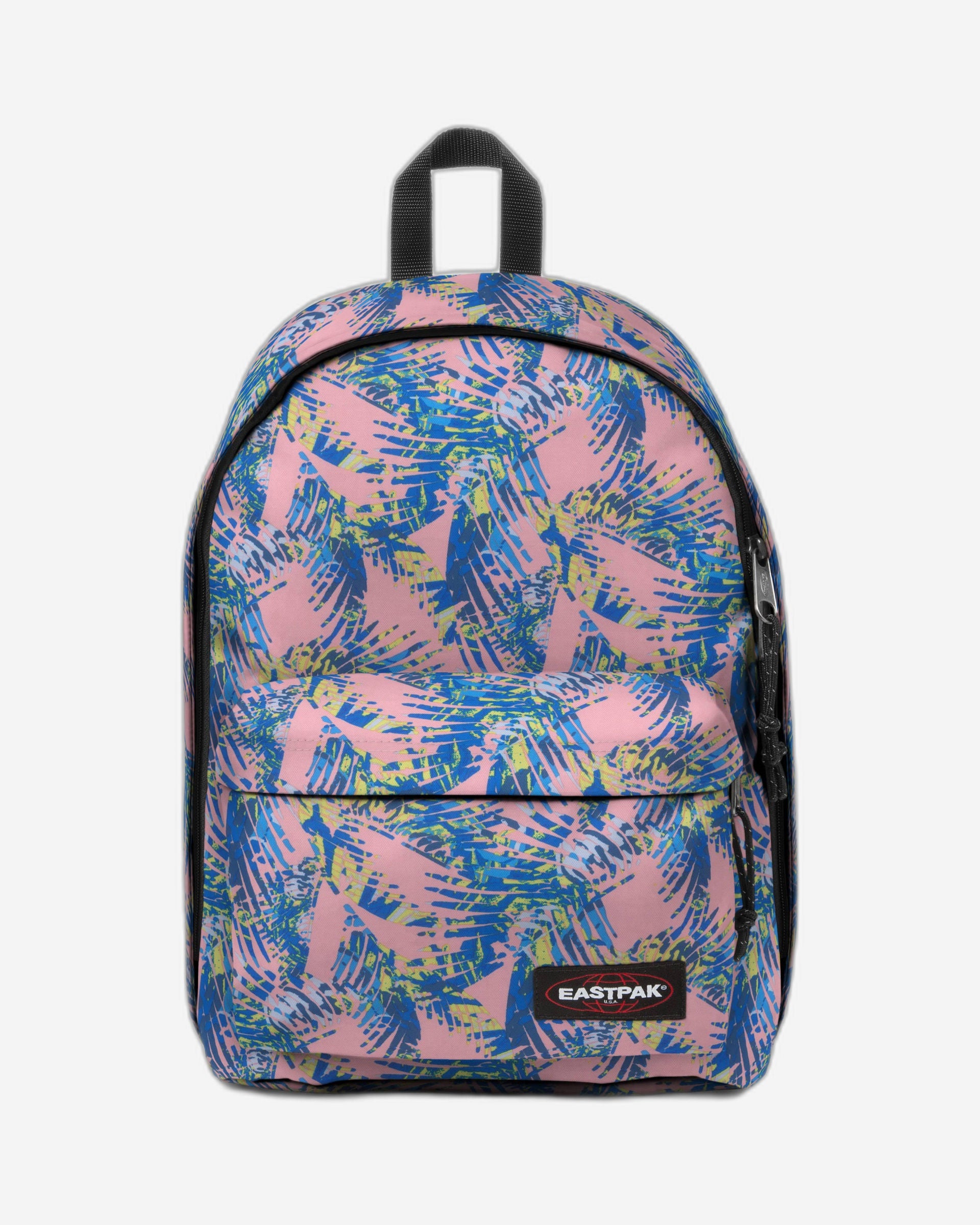حقيبة ظهر متوسطة الحجم وردية اللون من إيستباك، مزودة بفلتر بريز الوردي، تعمل بنظام "خارج المكتب".