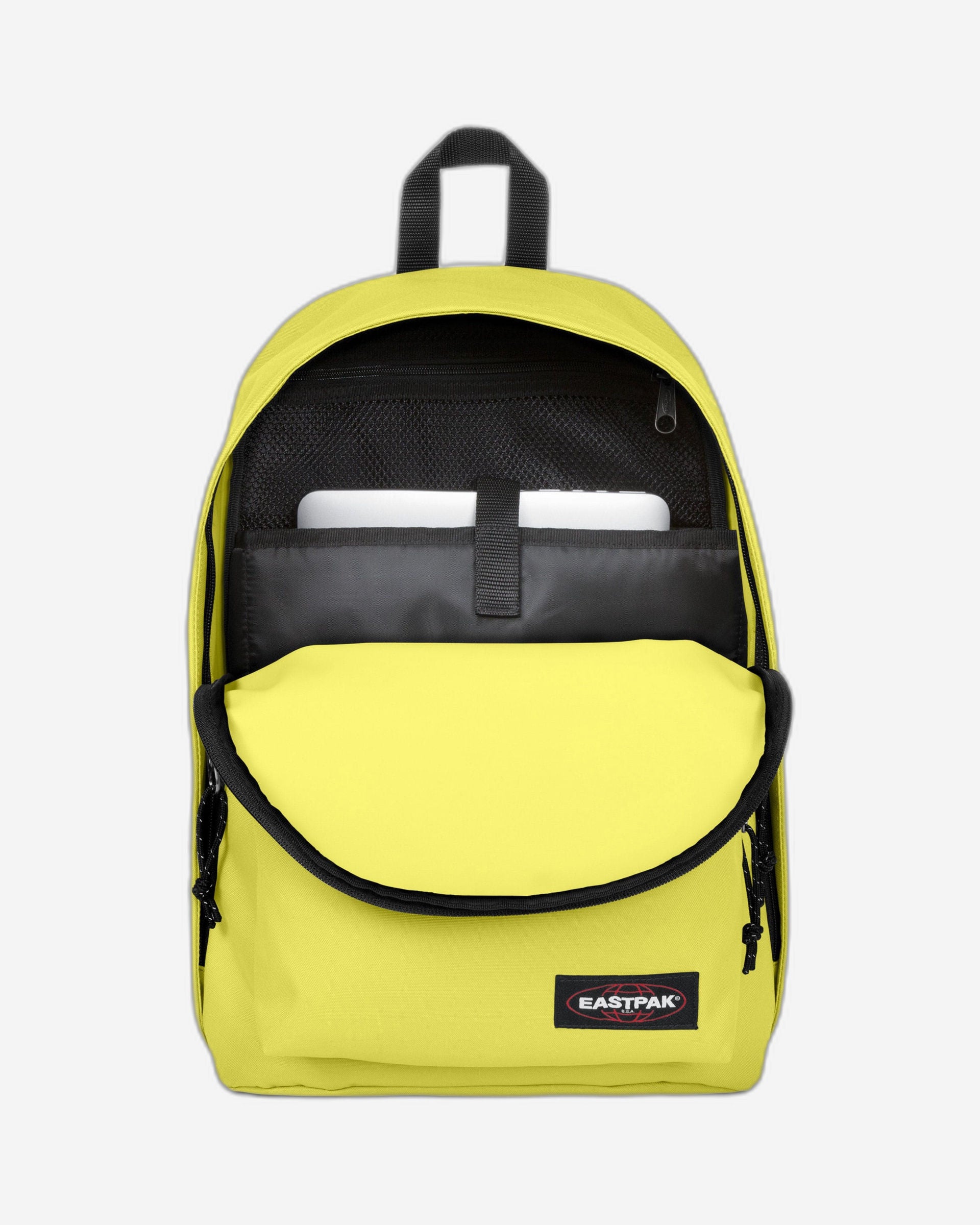 حقيبة ظهر متوسطة الحجم من إيستباك، لون أخضر ليموني نيون، مكتوب عليها "خارج المكتب"