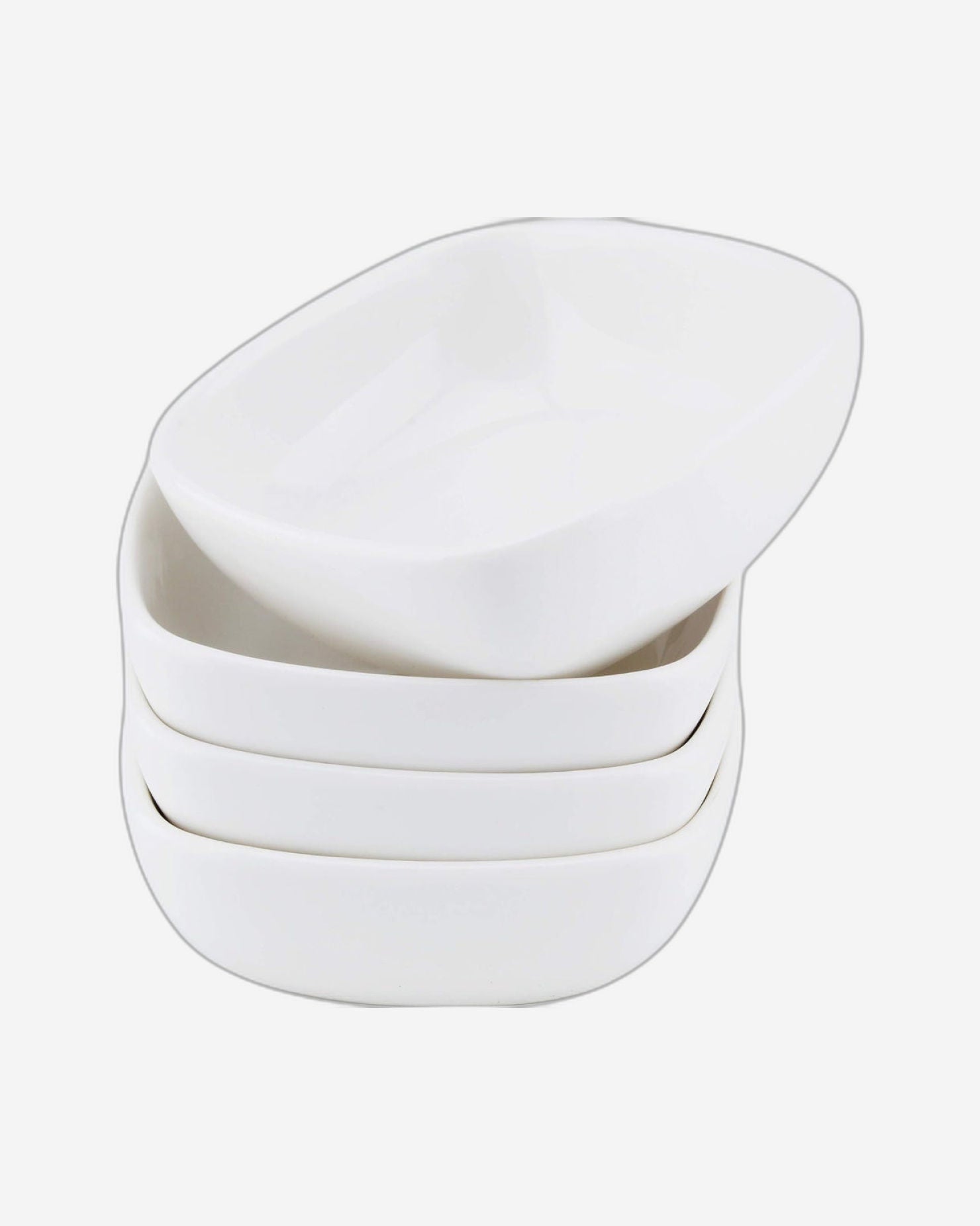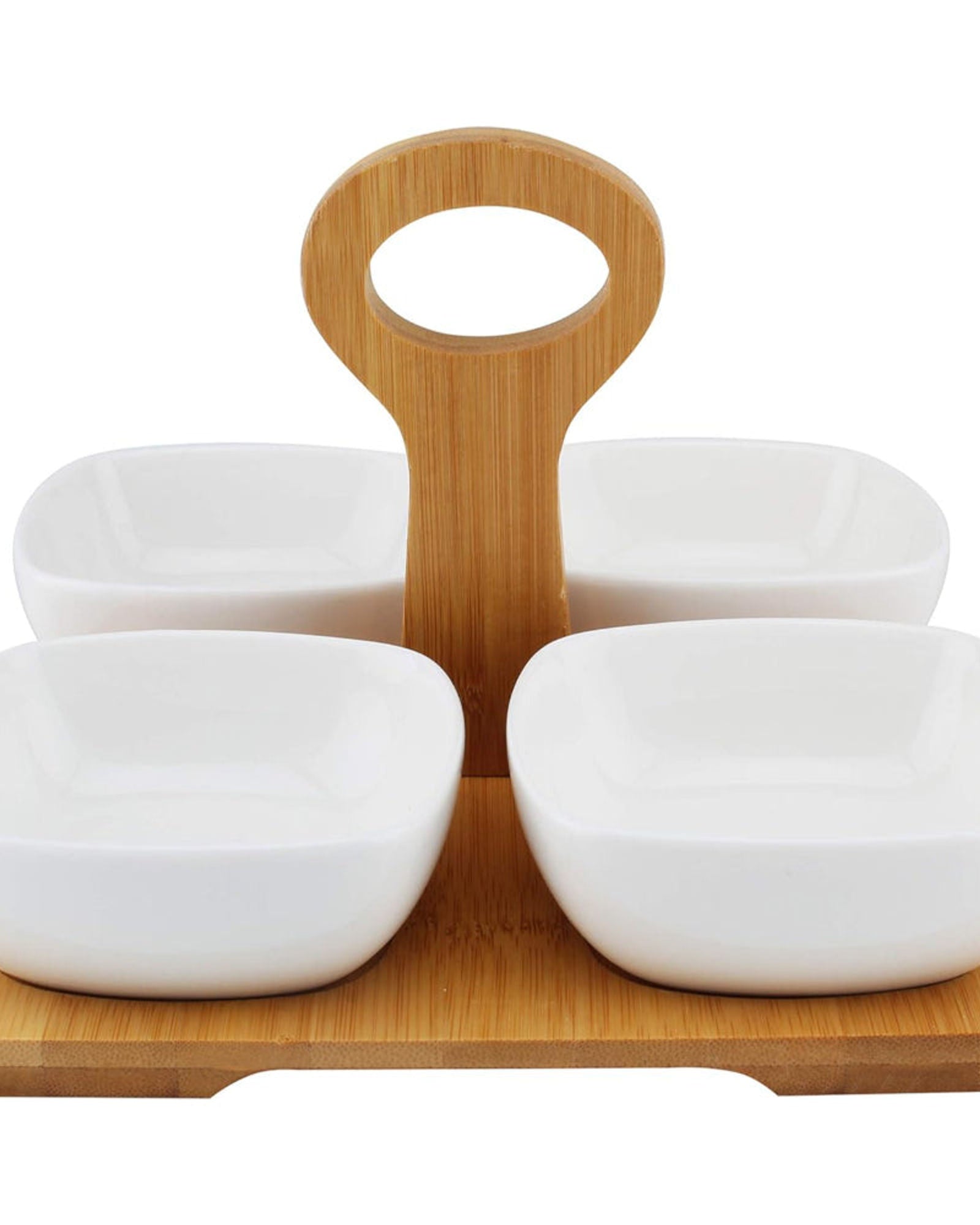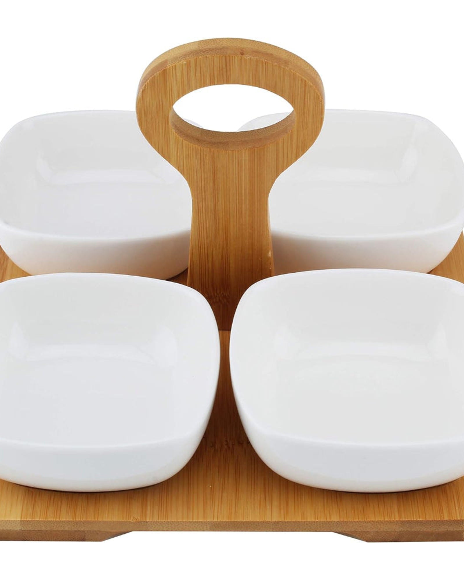 أوعية خزفية ضحلة مع صينية ومقبض من الخيزران، أبيض/بني، 4 قطع