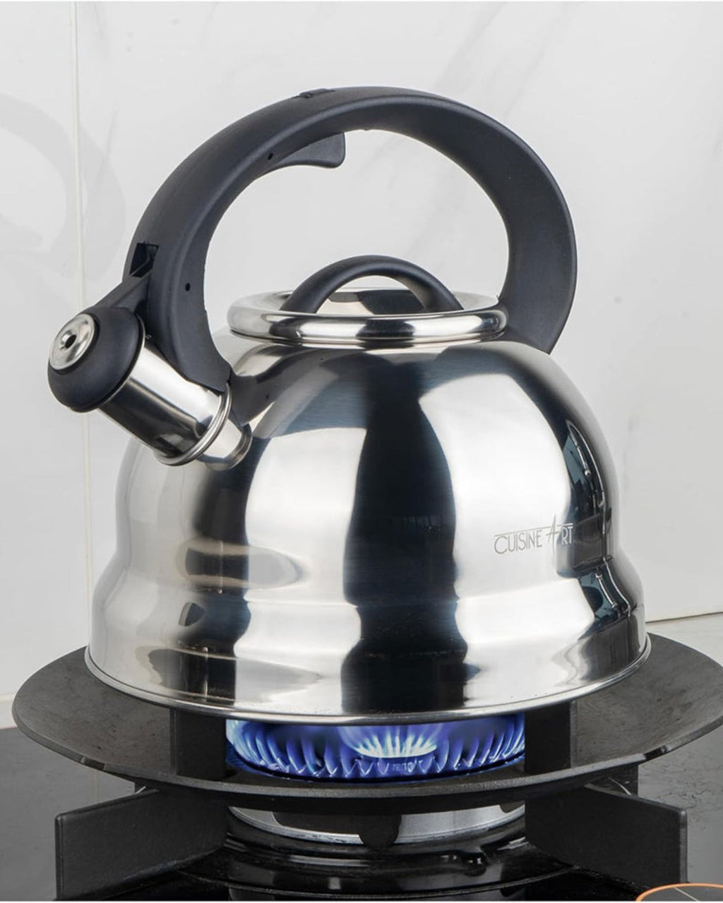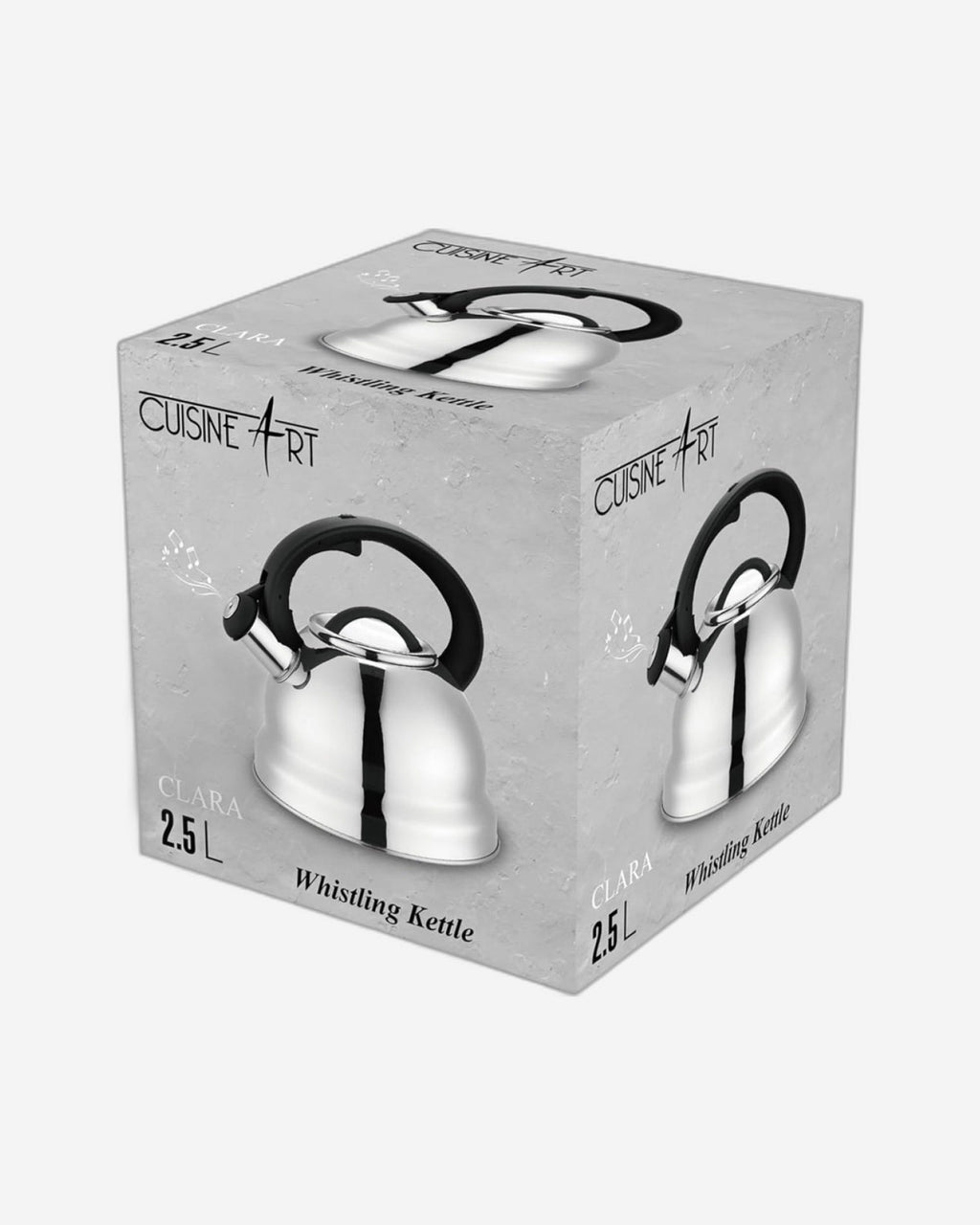 غلاية شاي صفارة من الفولاذ المقاوم للصدأ من كويزين آرت كلارا 201، سعة 2.5 لتر، فضية اللون، مصقولة بمرآة، مقبض نايلون ثابت، بطانة داخلية من الساتان، سريعة الغليان، مناسبة للاستخدام على جميع مواقد الطهي