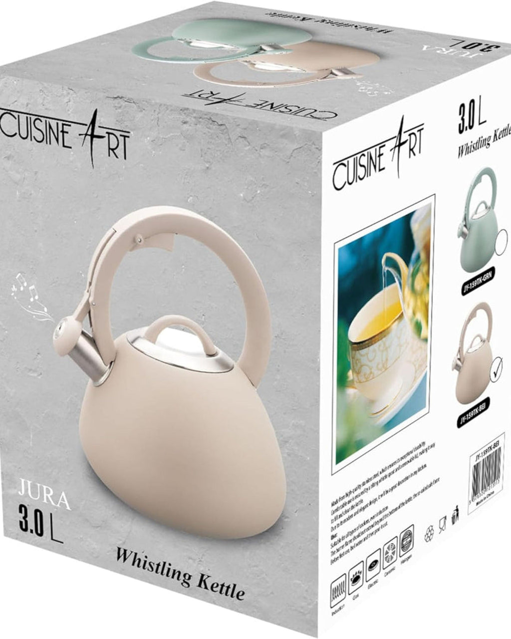 غلاية شاي صافرة من الفولاذ المقاوم للصدأ JURA من Cuisine Art، سعة 3.0 لتر، لون بيج، مصنوعة من الفولاذ المقاوم للصدأ 201، مقبض من النايلون، طلاء ناعم الملمس، غليان سريع، قاعدة واحدة 18/0، مناسبة للاستخدام على جميع مواقد الطهي