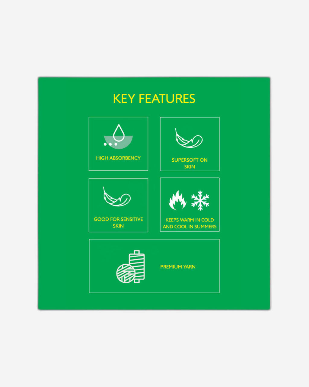* مثالية لجميع المواسم: الملمس الناعم للمنشفة والقدرة الفائقة على الامتصاص تجعلها مثالية للاستخدام على مدار العام، مما يوفر الراحة في المواسم الدافئة والباردة.