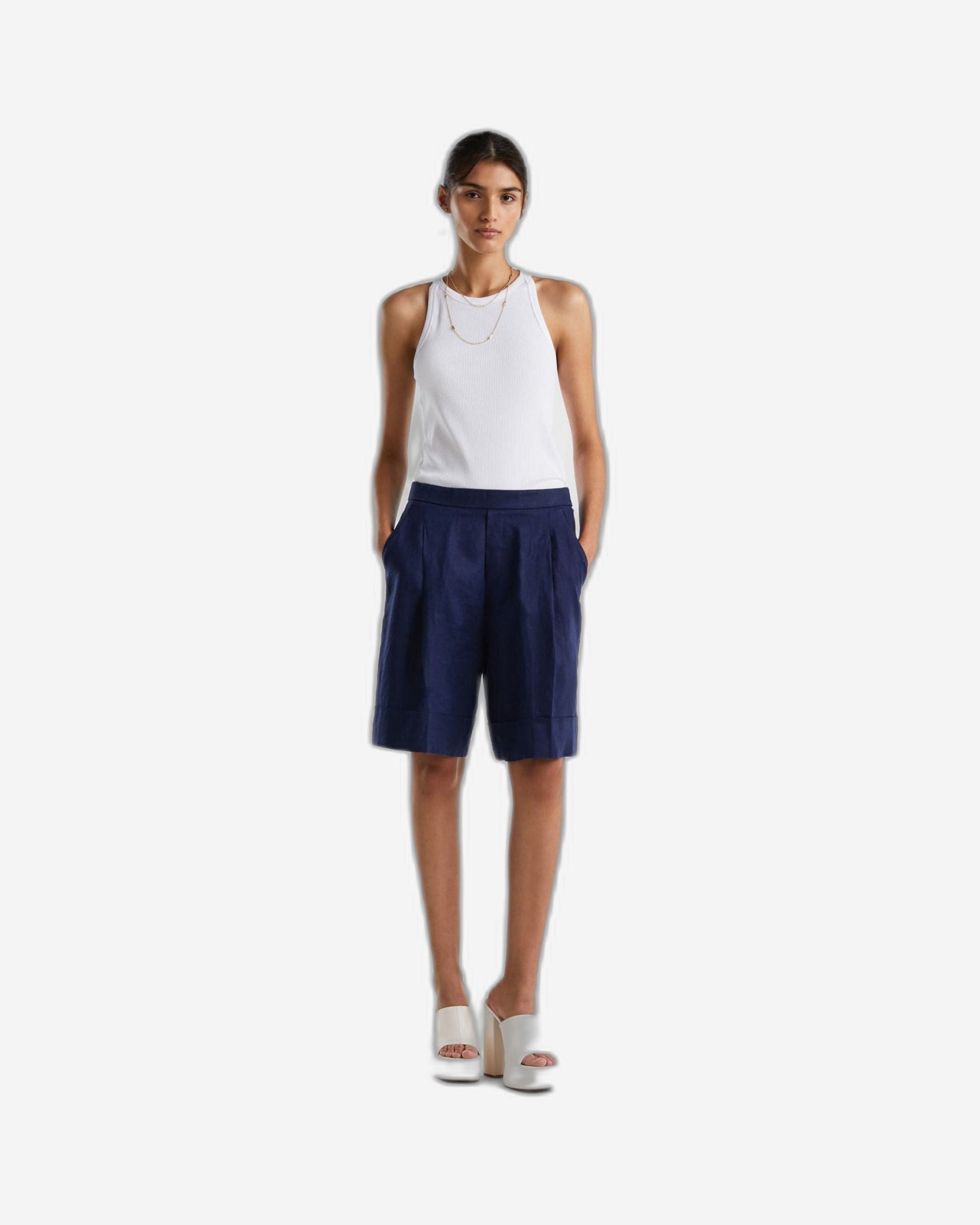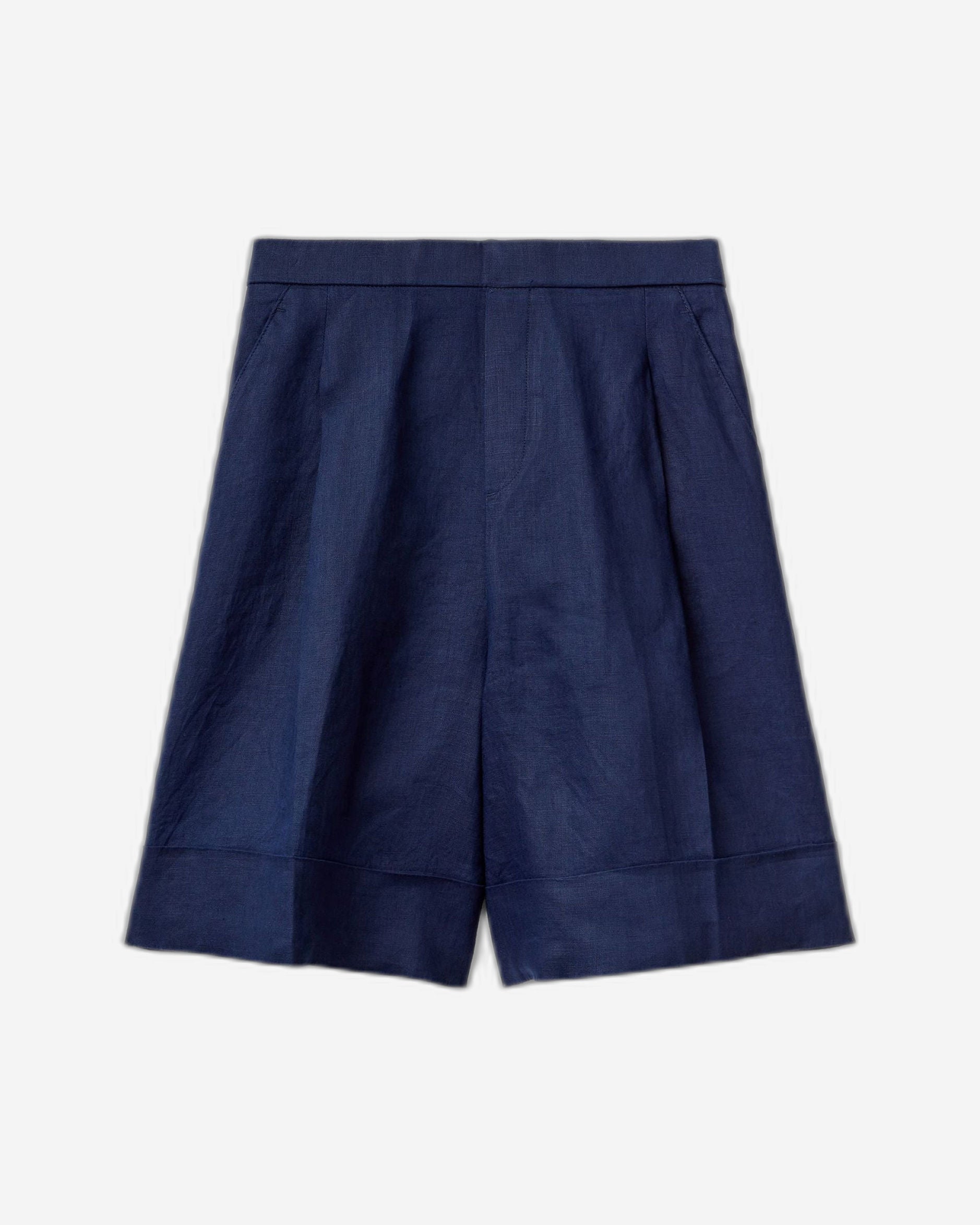 شورت برمودا من الكتان الخالص. ساق واسعة مع ثنية في المنتصف وأساور ثابتة عند أسفل الساق. خصر مرن في الخلف وجيوب أمامية مريحة. تصميم منعش ومريح.