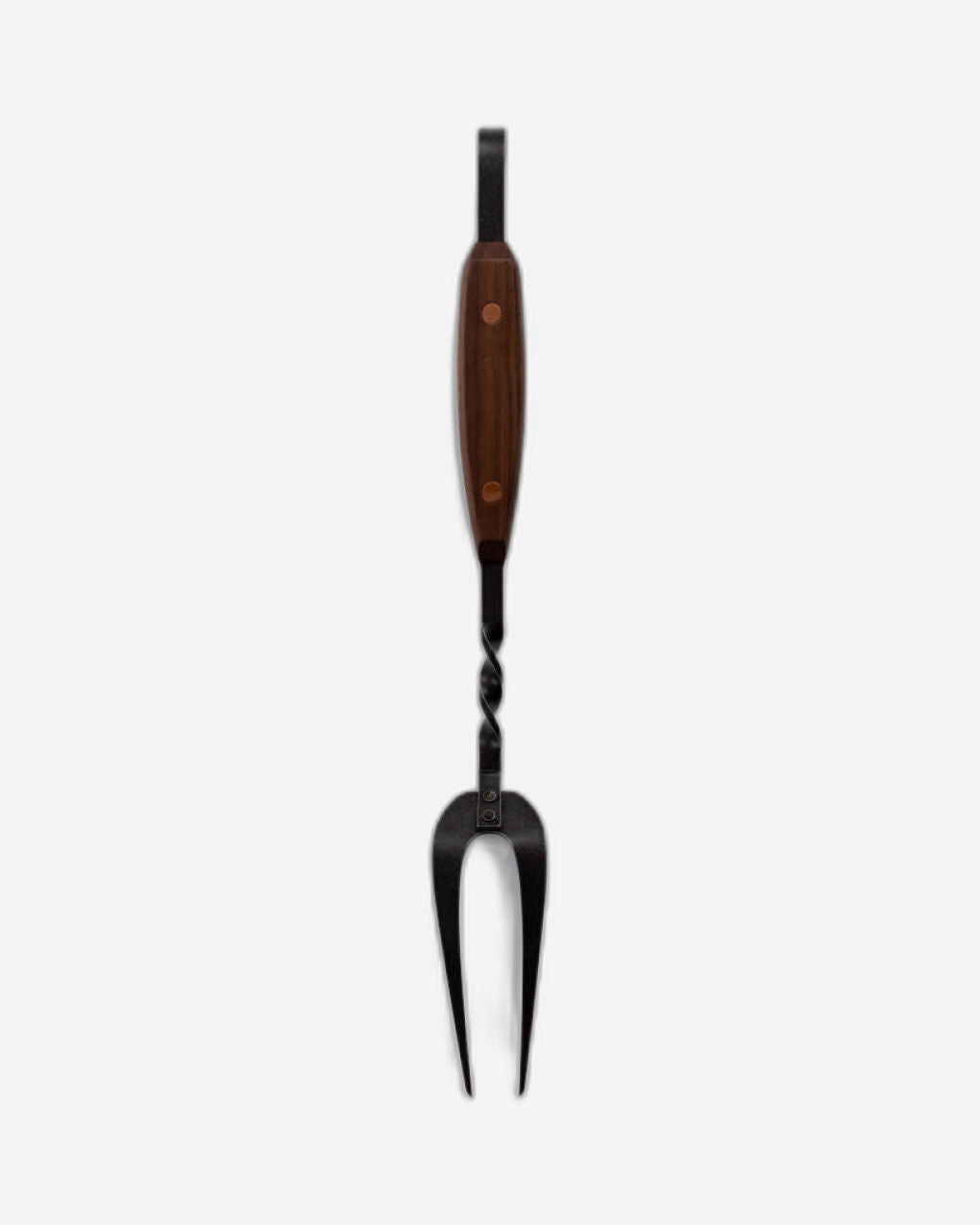 ثبّت الطعام في مكانه بإحكام لتقطيع أو نحت مثالي. صُممت هذه الشوكة للتقطيع لتُعلق وتُستخدم مع شواية كاوبوي فاير بيت، وهي مصنوعة من الفولاذ المقاوم للصدأ المطروق يدويًا، ومُزوّدة بمقبض ناعم من خشب الجوز الطبيعي يحافظ على برودته على درجات الحرارة العالية. صُممت لتوفير الراحة والأمان عند العمل بالقرب من النار والجمر الساخن.
