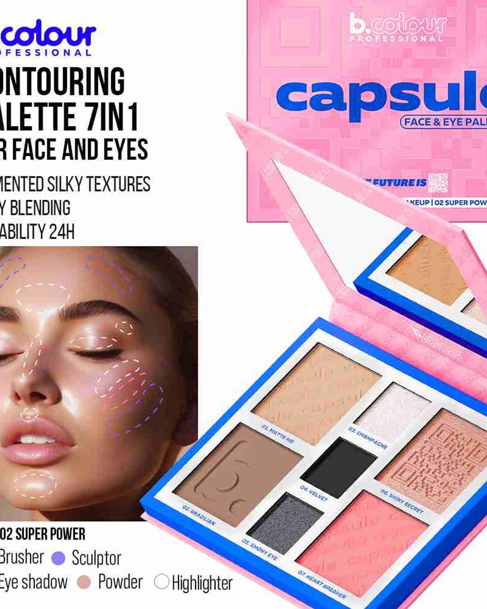 أطلقي العنان لإطلالتكِ المتألقة مع لوحة مكياج بي. كولور بروفيشنال سوبر باور 7 في 1 - مجموعة متكاملة لتحديد الوجه والعينين في علبة أنيقة ومدمجة. صُممت هذه اللوحة متعددة الاستخدامات للمحترفين وعشاق المكياج، وتتميز بـ 7 بودرة عالية الصبغة تدوم طويلًا، تُبرز جمال الوجه وتُبرز جمال العينين.