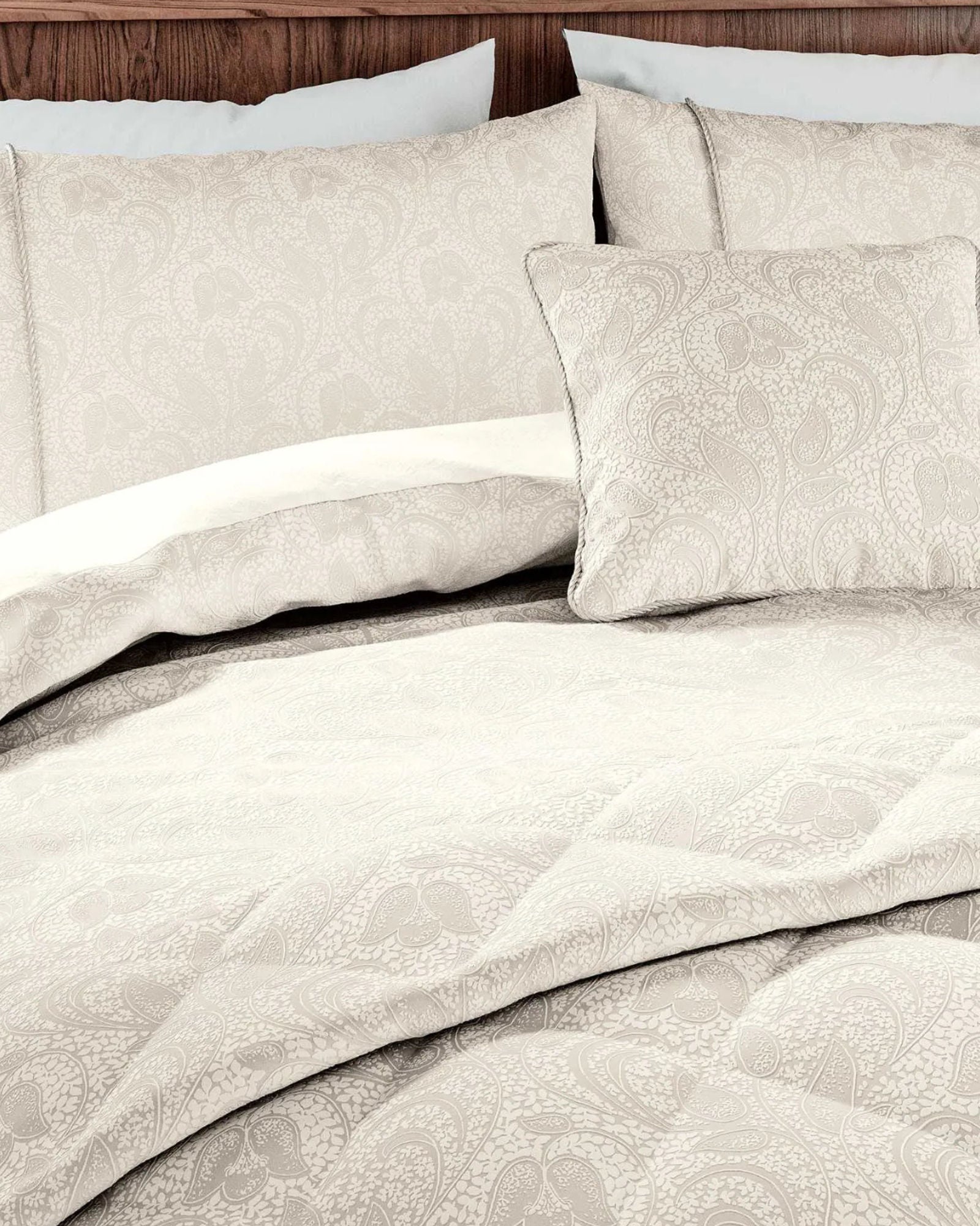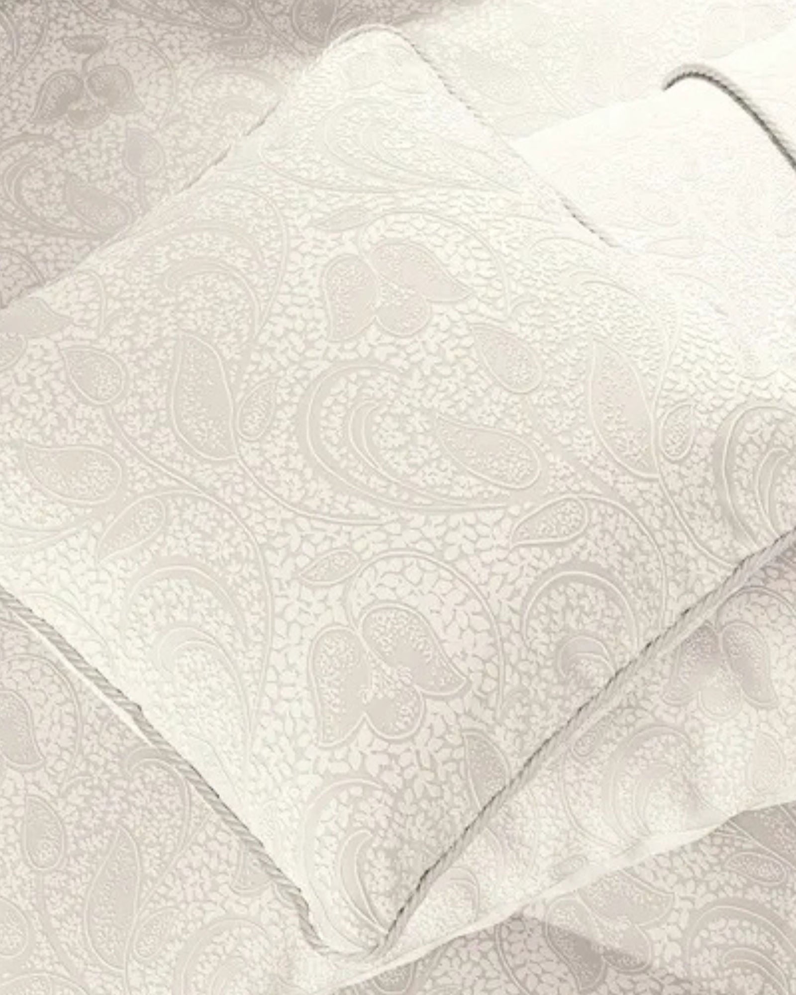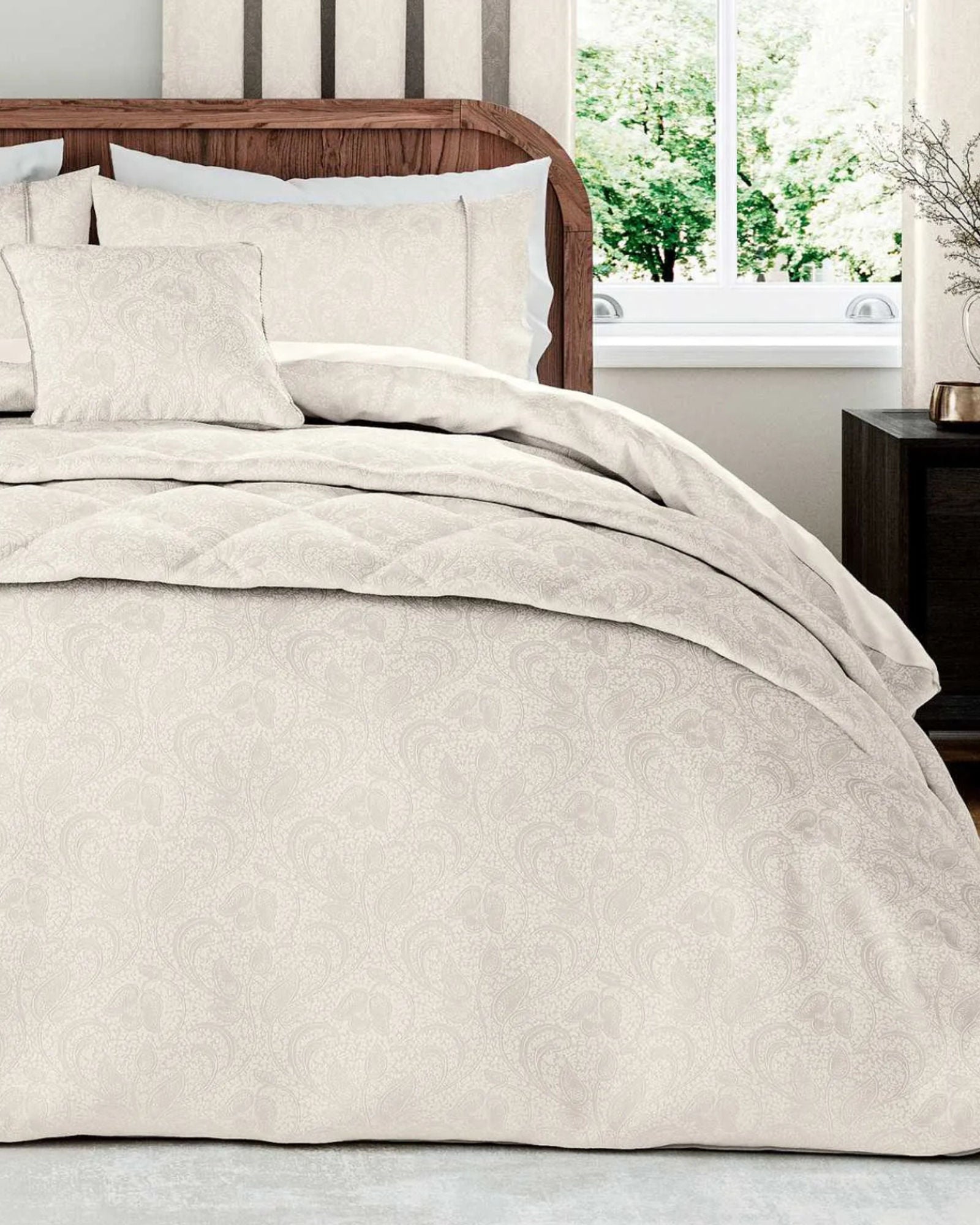 نقشة آشلي النباتية المتموجة مُجسّدة في نسيج جاكار ناعم الملمس. اللمسات النهائية أنيقة، مع إضافة زخارف حبلية على غطاء اللحاف وأغطية الوسائد والوسائد، بينما تُضفي لوحة الألوان لمسة عصرية على المجموعة.