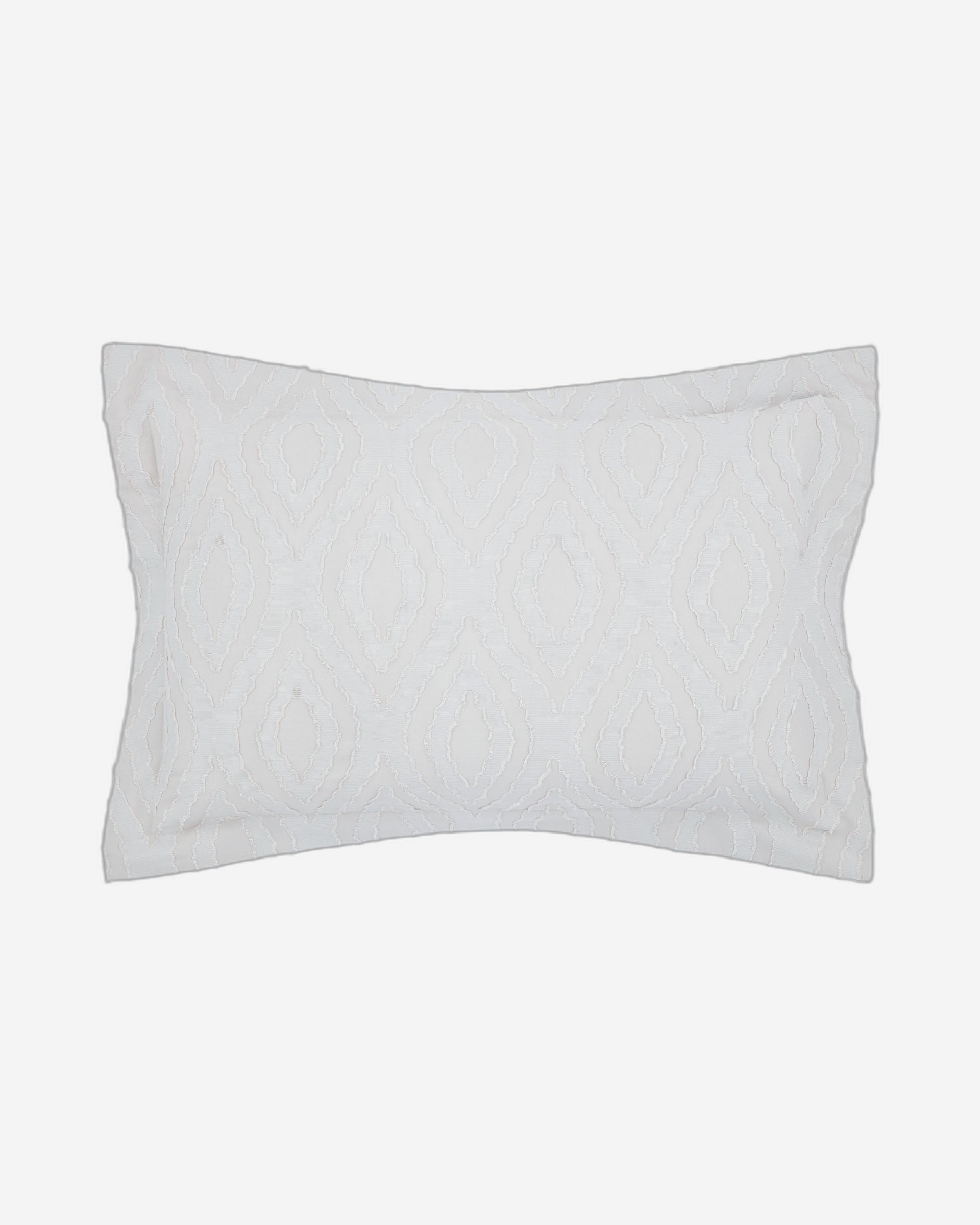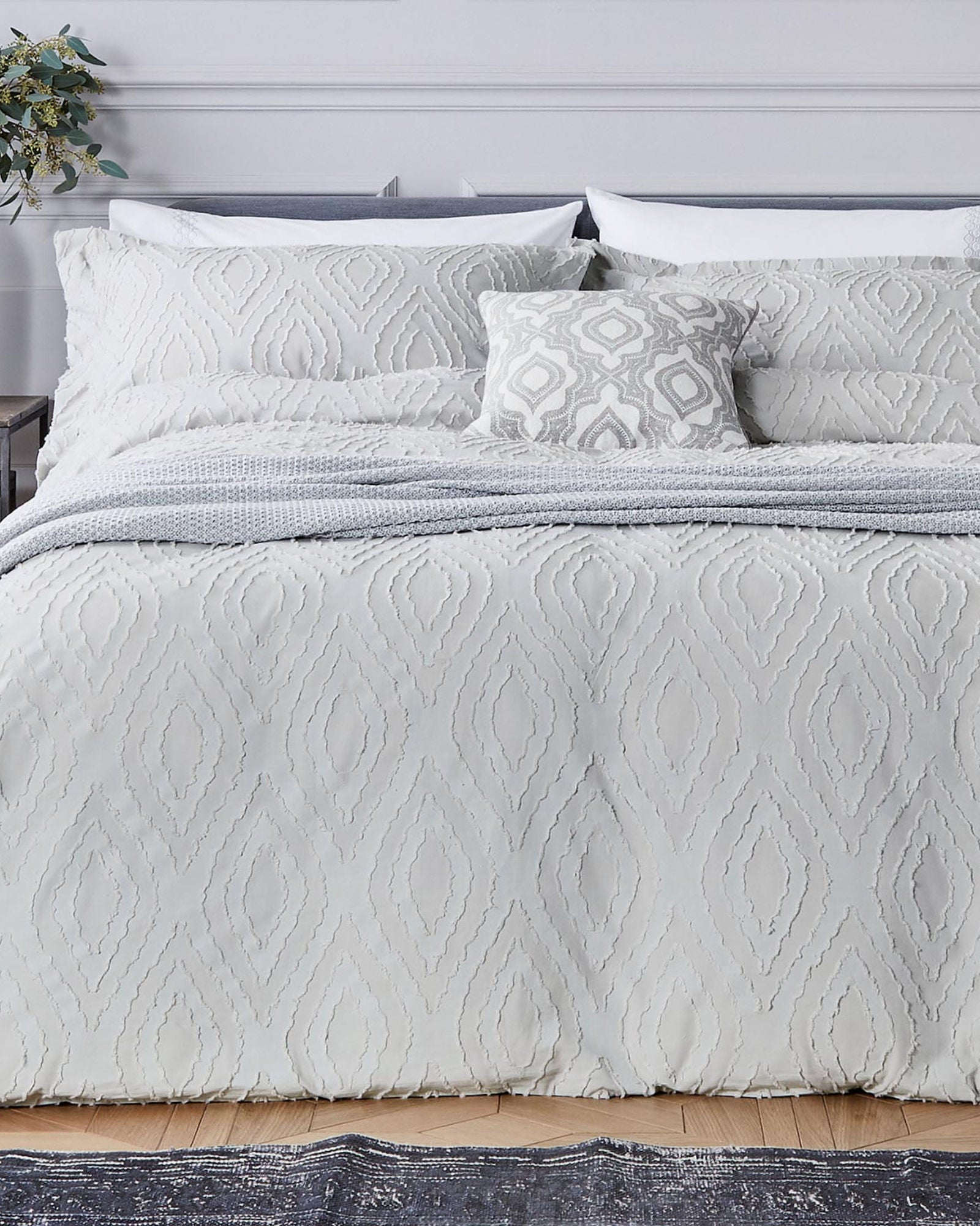ألوان هادئة تتناغم بجمال مع ملمس ناعم لإضفاء لمسة عصرية أنيقة. القطن الخالص مُعزز بنمط هندسي مُقصوص يتكرر على غطاء اللحاف وأغطية وسائد أكسفورد.