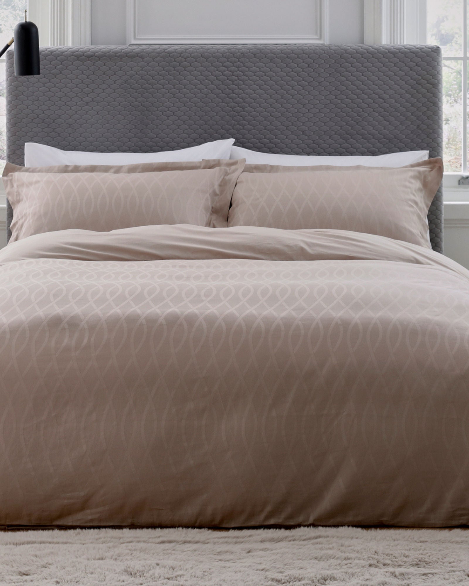 أضف لمسةً من الرقي إلى غرفة نومك مع هذا التصميم الجاكار الرقيق. يتميز هذا النمط بنمط شبكي ناعم متشابك يغطيه بالكامل بلون طباشيري عصري. مصنوع بإتقان من قطن ١٠٠٪، مع قماش بيركال ناعم من قطن ١٠٠٪، بكثافة خيوط ٢٥٠.