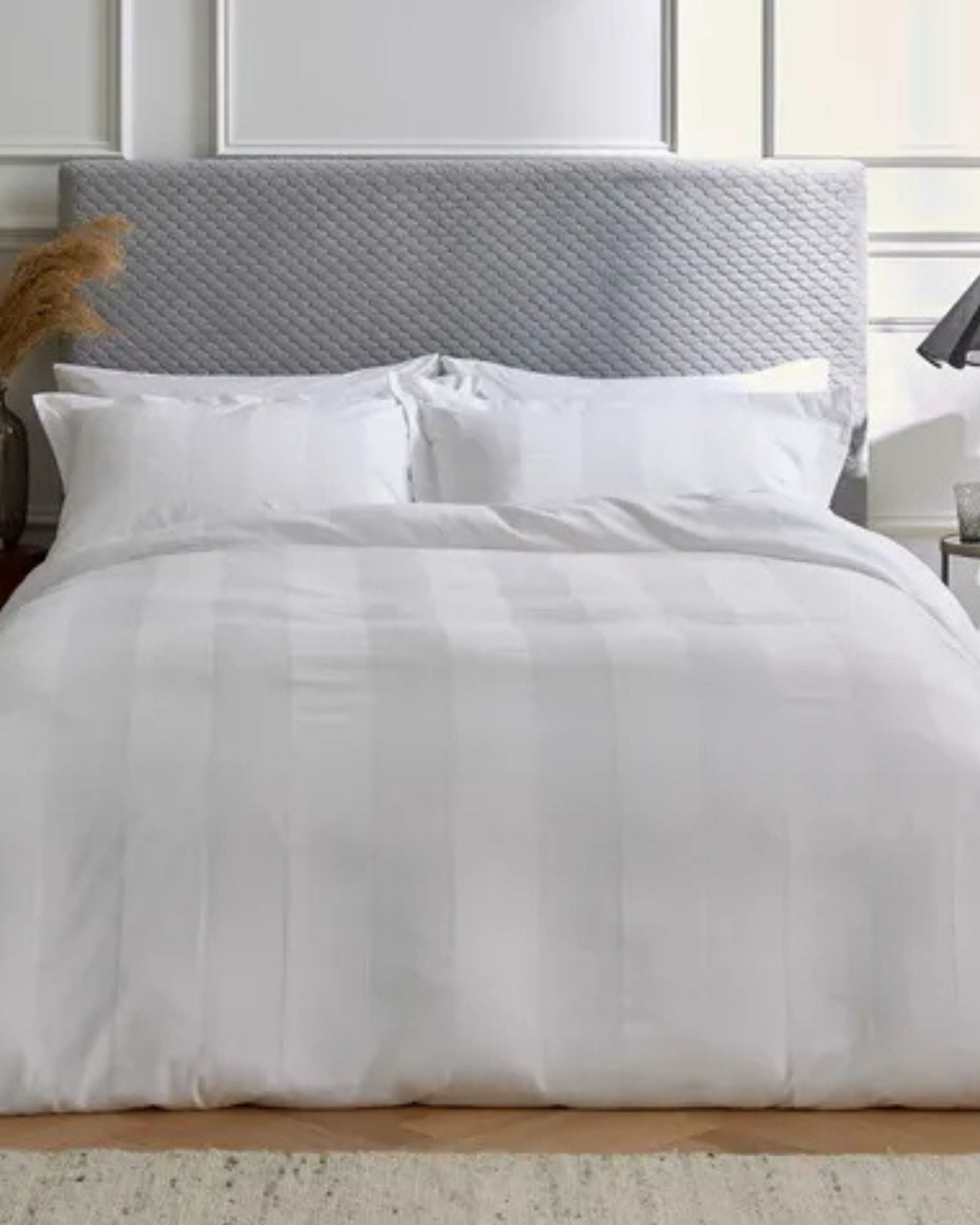 أضف لمسةً راقية من الخطوط إلى غرفة نومك مع سيرا. تصميمٌ رائعٌ بخطوط دوبي عمودية بلون أبيض ناصع، مثاليٌّ لإطلالةٍ بسيطة. مصنوعٌ من قطن ساتان 100% مع ظهرٍ من قماش بيركال قطني بـ 200 خيط.