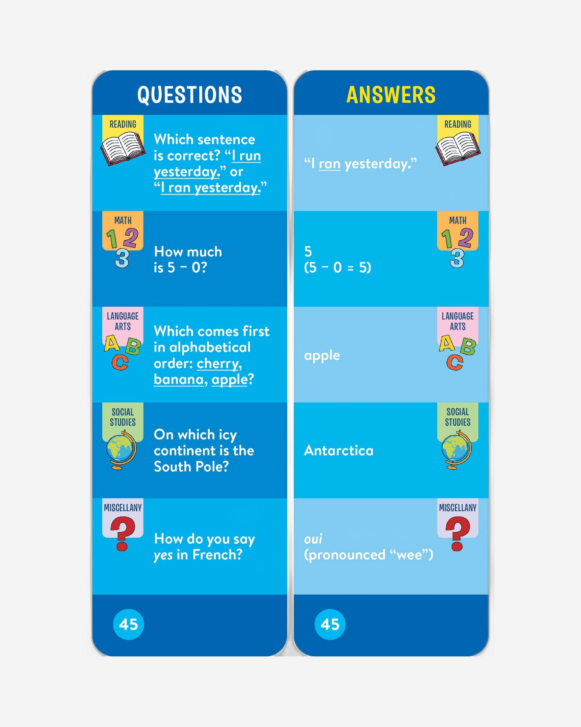 • مجموعتان كاملتا الألوان للأسئلة والأجوبة في صندوق تخزين قابل لإعادة الاستخدام