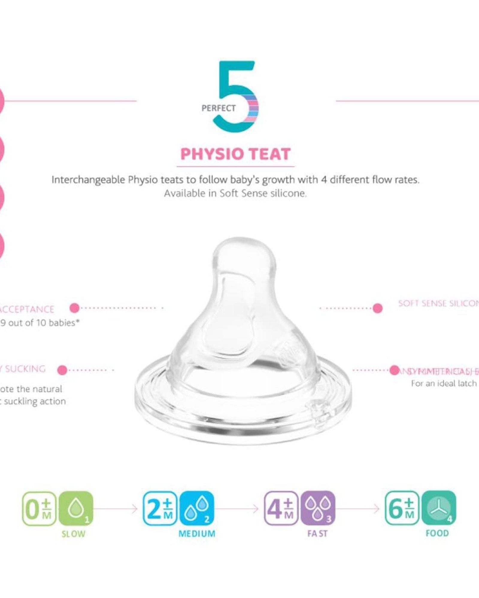 حلمات بيرفكت 5 القابلة للتبديل لمتابعة نمو طفلكِ بأربعة معدلات تدفق مختلفة. متوفرة بسيليكون سوفت سينس.