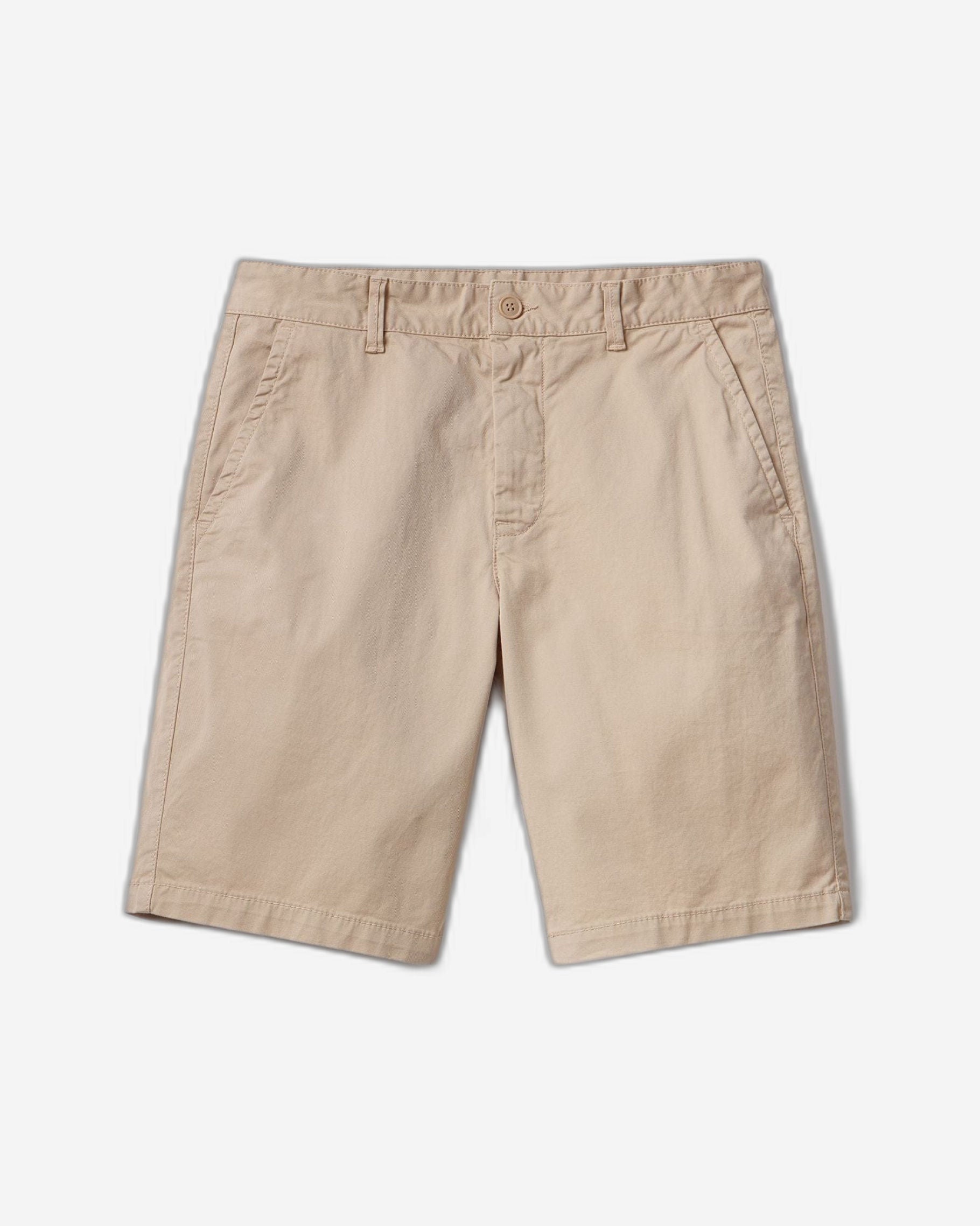 بنطلون قصير بنمط شينو من القطن المرن. جيوب أمامية وجيب صغير في الخلف. خصر مزود بحلقات للحزام، وفتحة سحاب وأزرار. تصميم أنيق وعملي يناسب الملابس اليومية.