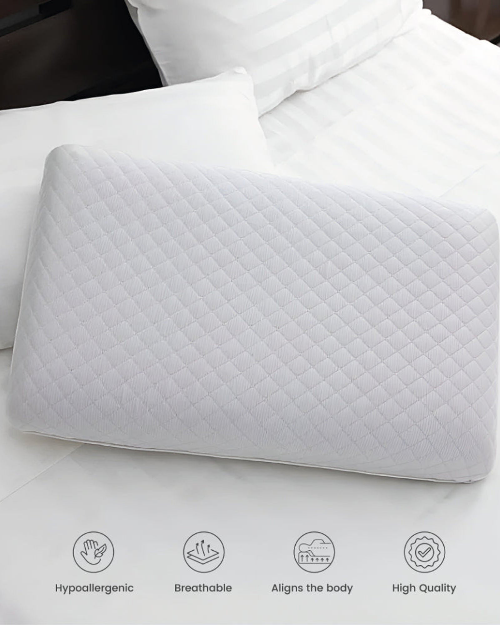 تتميز الوسادة بتصميم كلاسيكي، بمقاس واسع 40×70 سم وارتفاع 12 سم، مما يوفر مساحة واسعة ودعمًا لنوم مريح. يساعد تصميم الوسادة المنحني على تقليل نقاط الضغط، مما يسمح لعضلاتك بالاسترخاء ويخفف آلام الرقبة والكتف.