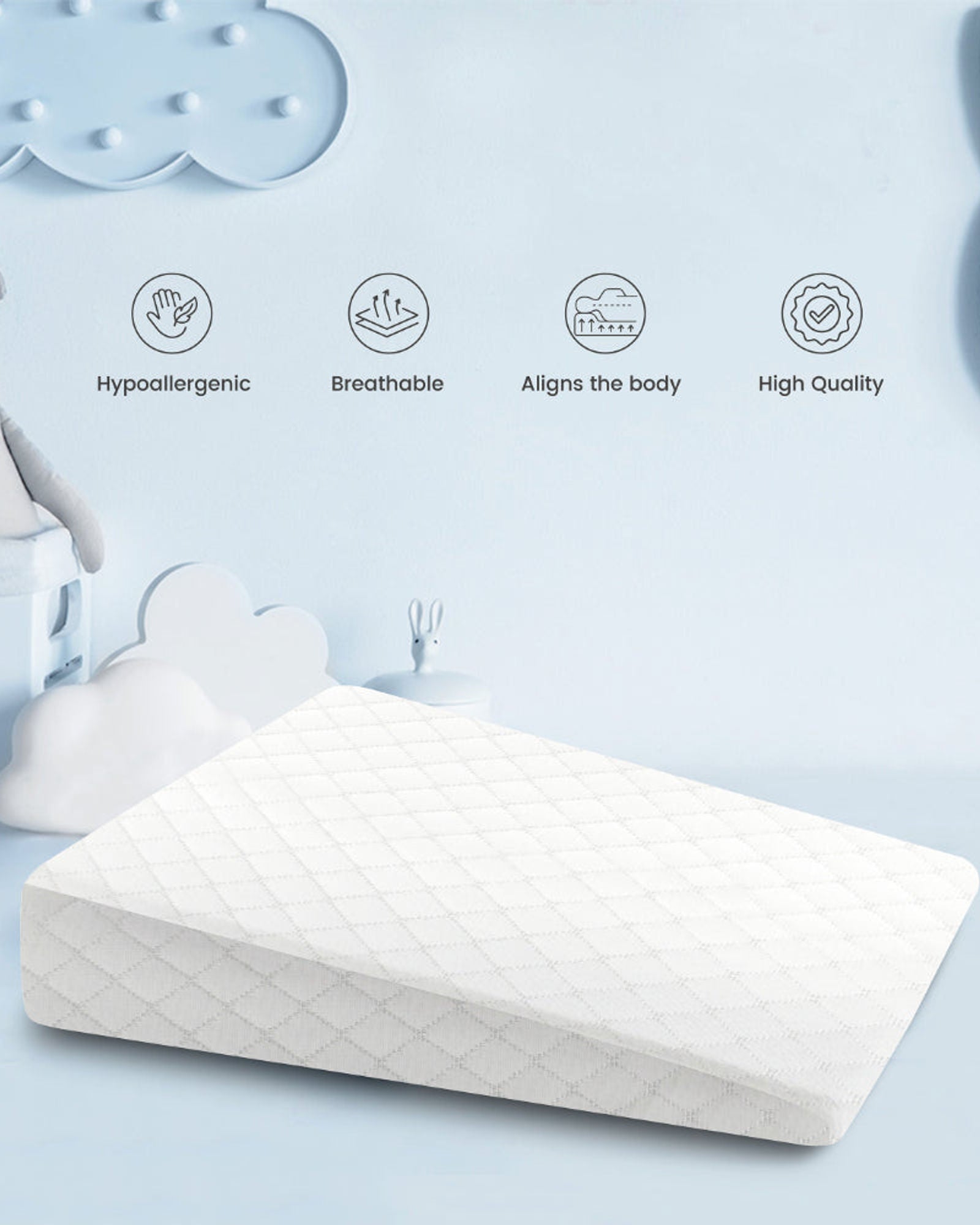 تتميز الوسادة بتصميم إسفيني ناعم، بارتفاع 11 سم من أحد الجانبين و3 سم من الجانب الآخر، مما يوفر زاوية مثالية لرفع رأس طفلك، ويساعد على الهضم، ويقلل من ارتجاع المريء، ويمنع متلازمة الرأس المسطح. بأبعاد 40 × 60 سم، تتناسب هذه الوسادة تمامًا مع أي سرير أطفال عادي، سواءً كان سريرًا للأطفال أو سريرًا للأطفال الصغار.
