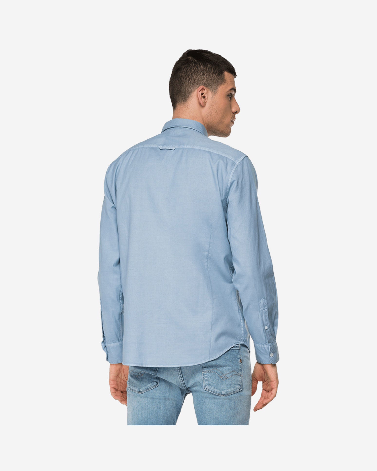 قميص رجالي من القطن المائل واللايوسل المصبوغ، مقاس عادي، ياقة كلاسيكية، نير خلفي، جيب بتطريز على شكل حرف R على الصدر، أكمام بأزرار، حاشية مستديرة، إغلاق بأزرار كلاسيكية بألوان متباينة.