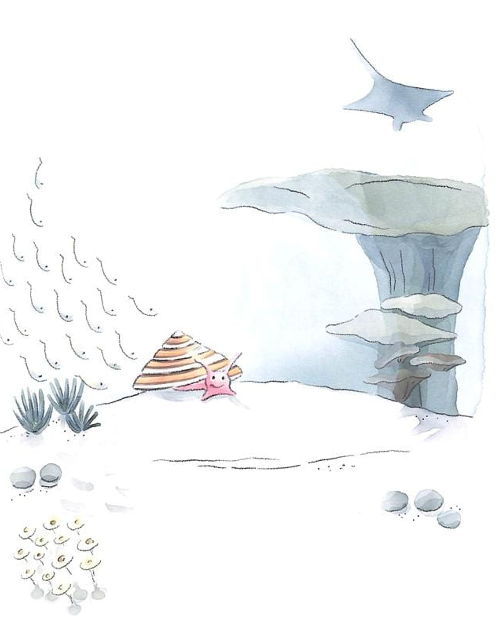 تتضمن رسومات جميلة لسرطان البحر، وسمك القرش، والسمكة، والحلزون، جميعها في بيئتها الطبيعية. سيتعلم الأطفال كيف تتحرك هذه المخلوقات وتأكل، وسيلاحظون ألوانها وأشكالها، وبعض الصفات الطريفة التي أبدعها المؤلف لكل منها. الصفات الغنية والنص المتناغم مثاليان للقراء في مرحلة النمو، حيث يحفزان الأطفال على استخدام خيالهم وطرح الأسئلة، ويبقيانهم مركزين على التفاصيل الطريفة.