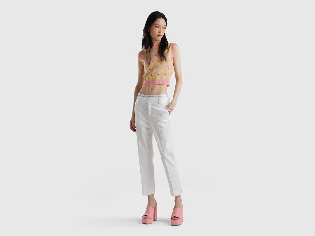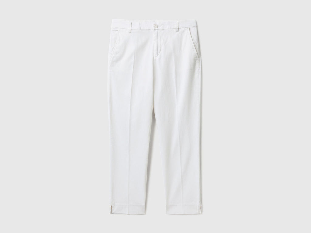 بنطلون تشينو طويل من القطن المرن. قصة ضيقة وقصّة قصيرة قليلاً مع فتحات أسفل الساق. جيوب أمامية، وظهر بثنيات وجيوب بأزرار. قطعة أساسية ومتعددة الاستخدامات، يمكن ارتداؤها مع حذاء رياضي أو حذاء بكعب عالٍ للمناسبات الرسمية.