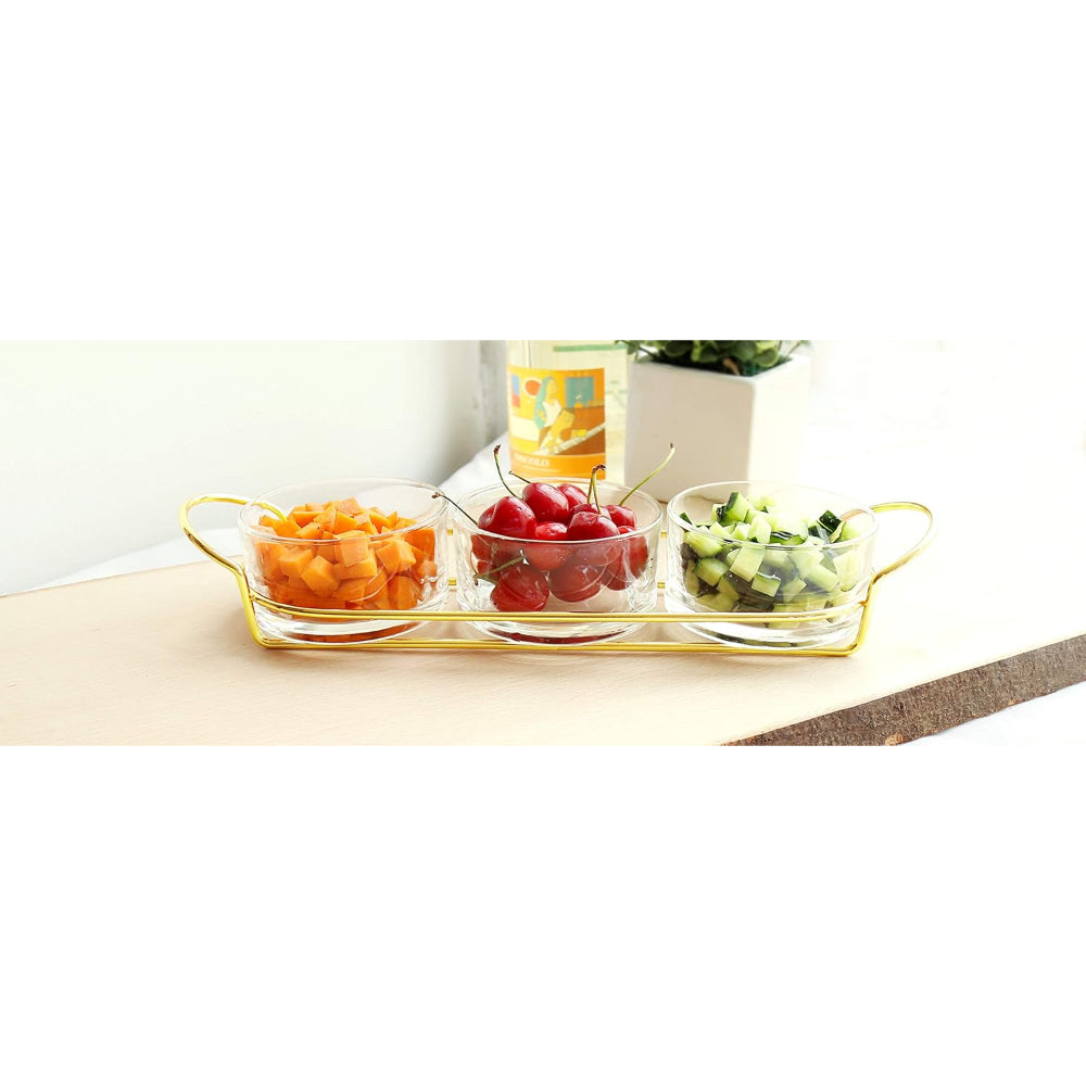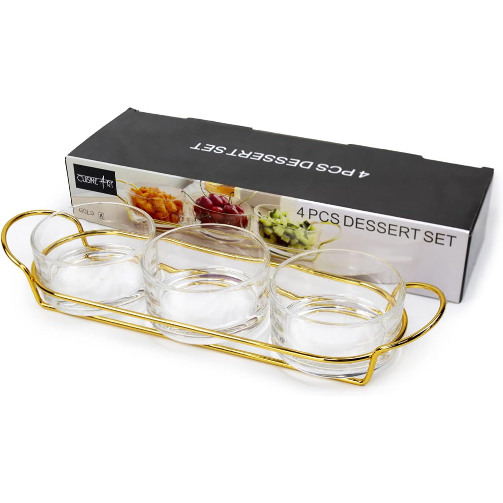 طقم حلوى زجاجي ذهبي من كويزين آرت مع حامل معدني أنيق - طقم حلوى للحفلات مكون من 4 قطع