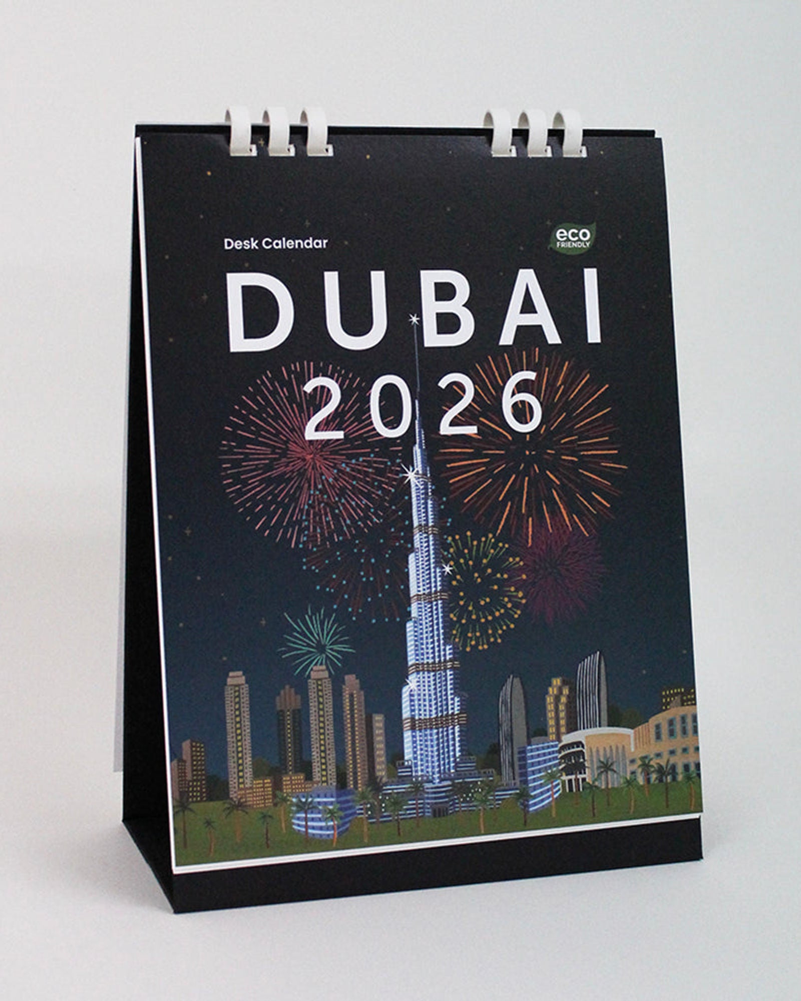 احتفل بجمال دبي كل يوم من أيام السنة مع هذا التقويم المكتبي الرائع لعام ٢٠٢٦. يضم هذا التقويم ١٢ رسمًا نابضًا بالحياة لأشهر معالم المدينة - من برج خليفة وبرج العرب إلى عين دبي وبرواز دبي - كل شهر يجسد روح هذه الوجهة العالمية وطاقتها. صُمم هذا التقويم مع مراعاة الاستدامة، فهو مطبوع على ورق مُعاد تدويره بعد الاستهلاك، ومُغلّف بحلقة ورقية صديقة للبيئة، مما يُسهّل إعادة تدويره بعد الاستخدام. مثالي لمكتبك أو كهدية مميزة، يجمع هذا التقويم بين العملية والتصميم الفني، ويمنحك إلهامًا طوال العام.
