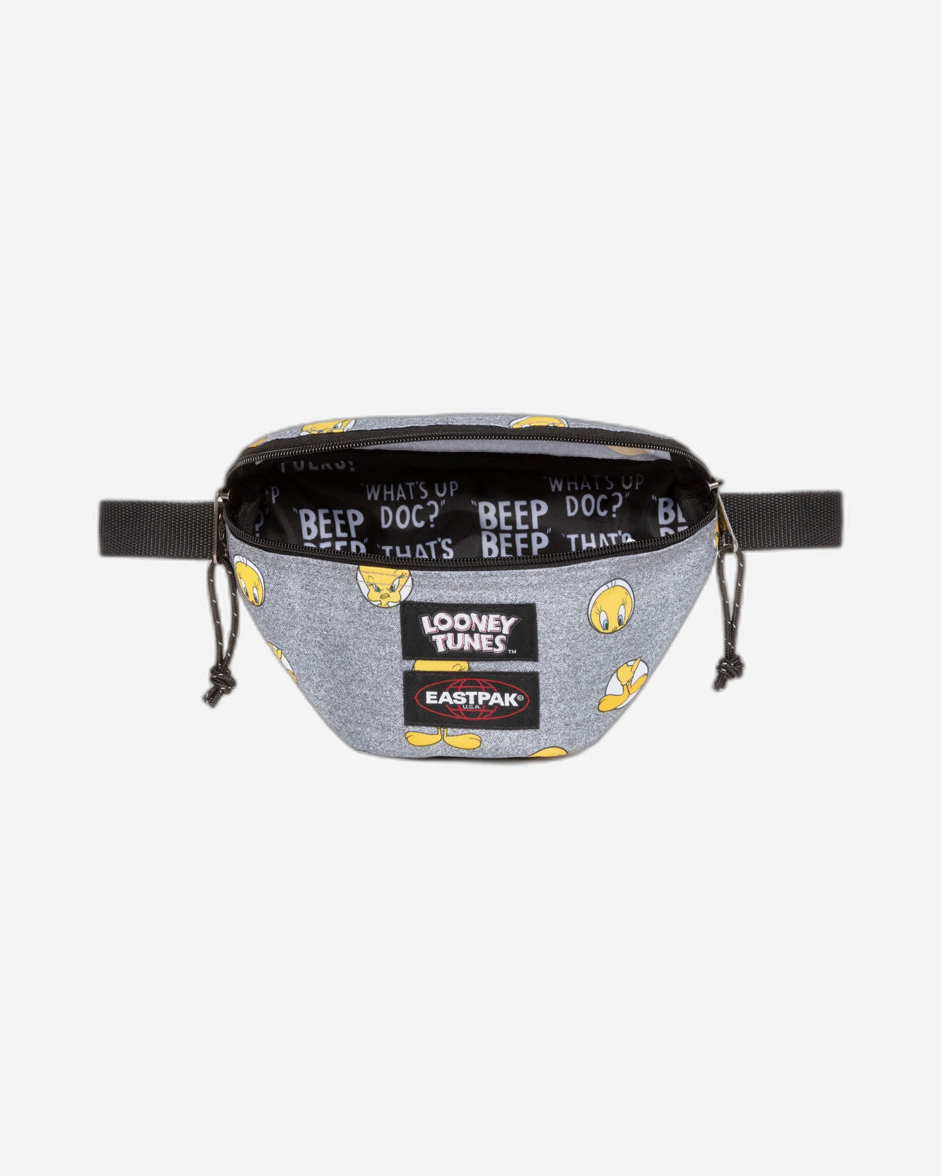 يُشيد تعاوننا الرسمي مع لوني تونز بسلسلة الرسوم المتحركة. تتميز حقيبة الخصر الكلاسيكية من إيستباك بطبعة مرحة لشخصية تويتي بيرد، بالإضافة إلى شعارات مشتركة وبطانة تحمل اقتباسات من السلسلة.