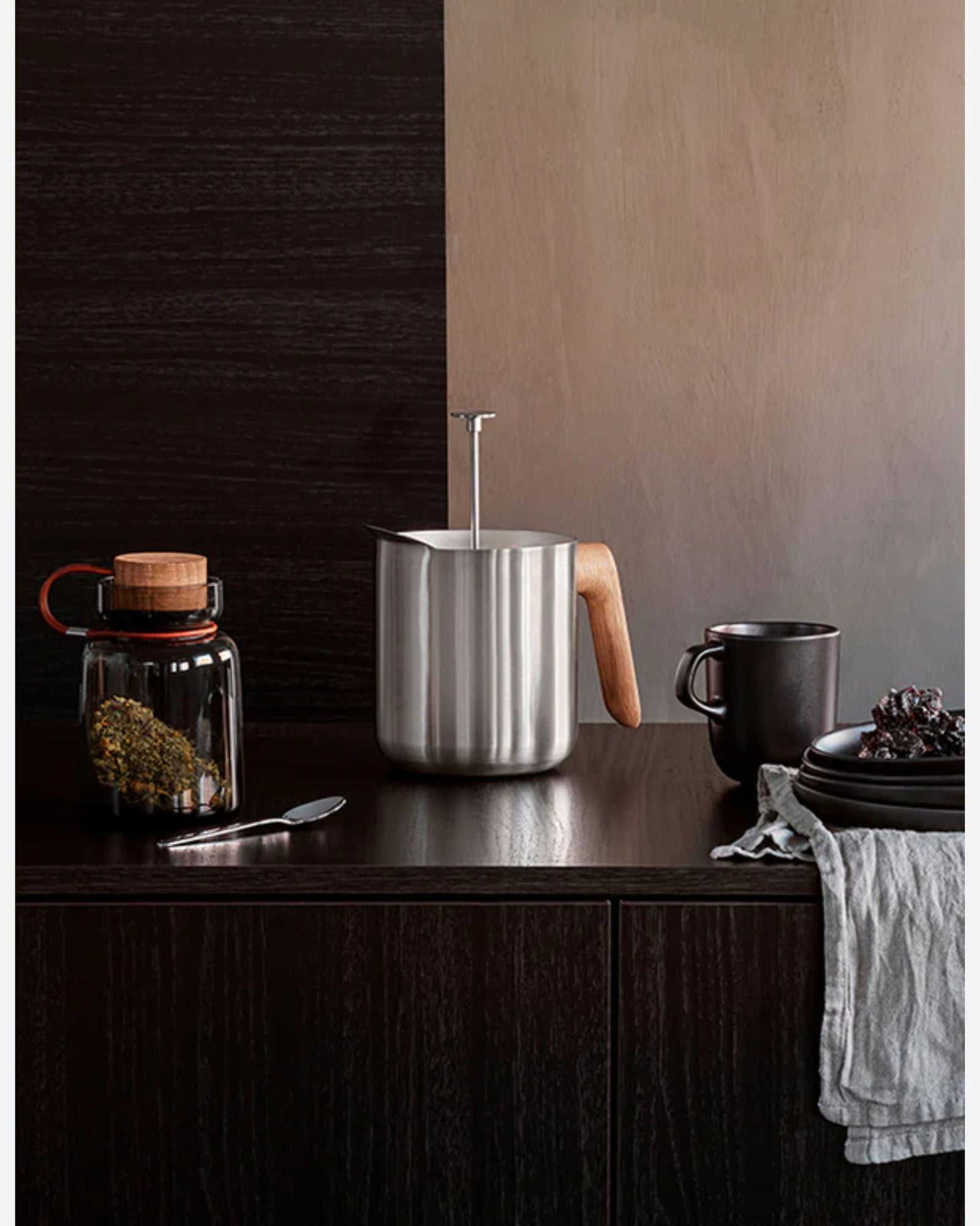 ماكينة تحضير الشاي إيفا سولو 520432 من مجموعة نورديك كيتشن هي ماكينة أنيقة وعملية لتحضير الشاي على الطريقة الفرنسية، مصممة خصيصًا للشاي السائب. يتميز هيكلها المصنوع من الفولاذ المقاوم للصدأ بجدار مزدوج يوفر عزلًا حراريًا يحافظ على الشاي ساخنًا لفترة أطول، بينما يتيح لك المكبس نقع الشاي للحصول على القوة التي تفضلها. بفضل مقبضها المصنوع من خشب البلوط الطبيعي، وفوهتها المانعة للتنقيط، وتصميمها الاسكندنافي الأنيق، فهي تجمع بين الأداء المتميز والمظهر الجذاب.