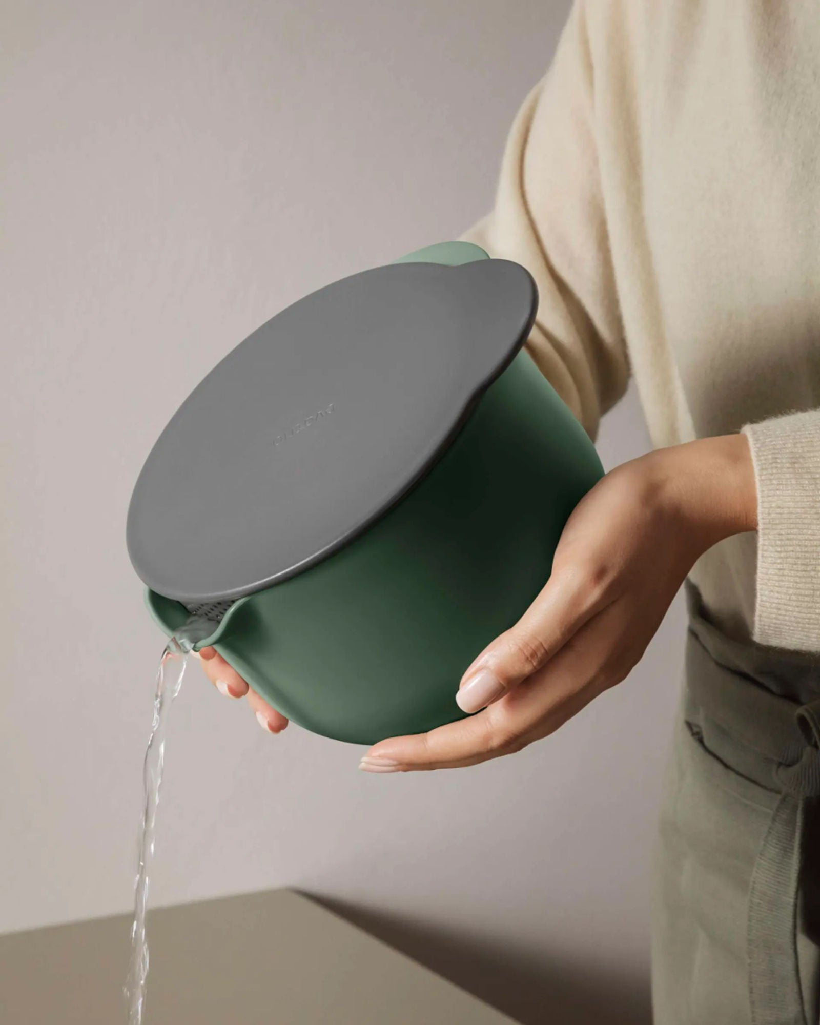 • إحدى الفتحات عبارة عن فتحة تشبه المصفاة، مما يسمح لك بتصفية السوائل (مثل الماء من الطعام المغسول أو المعكرونة) دون استخدام مصفاة منفصلة.