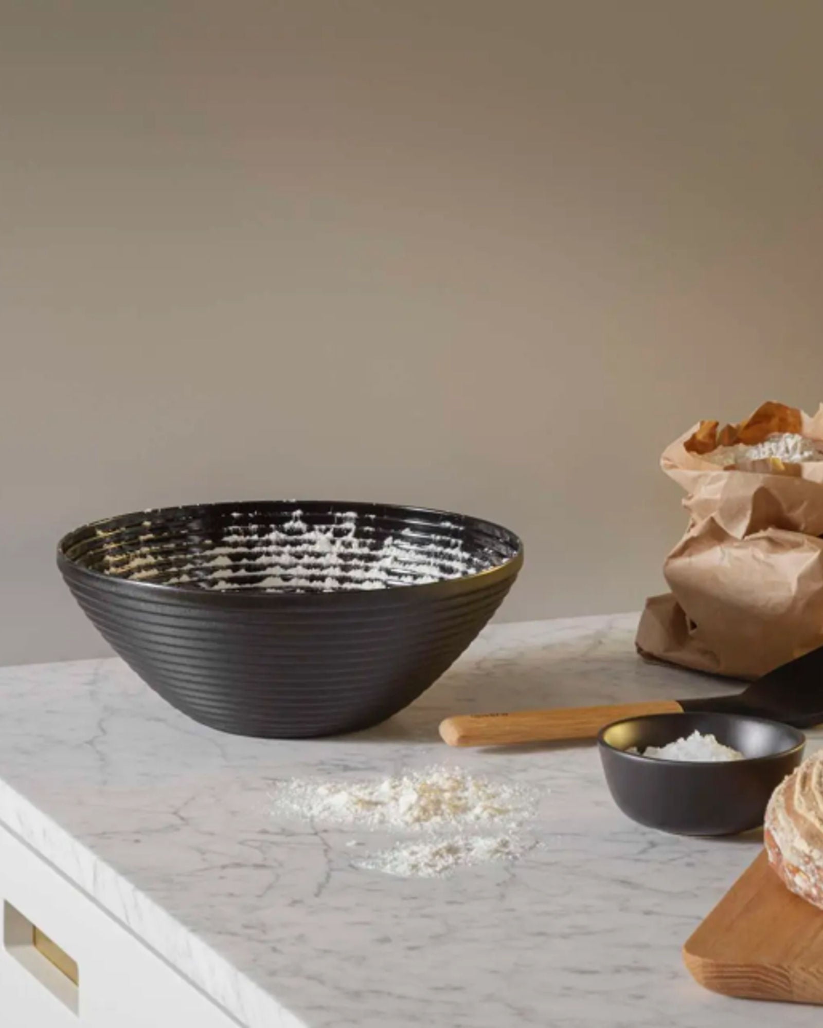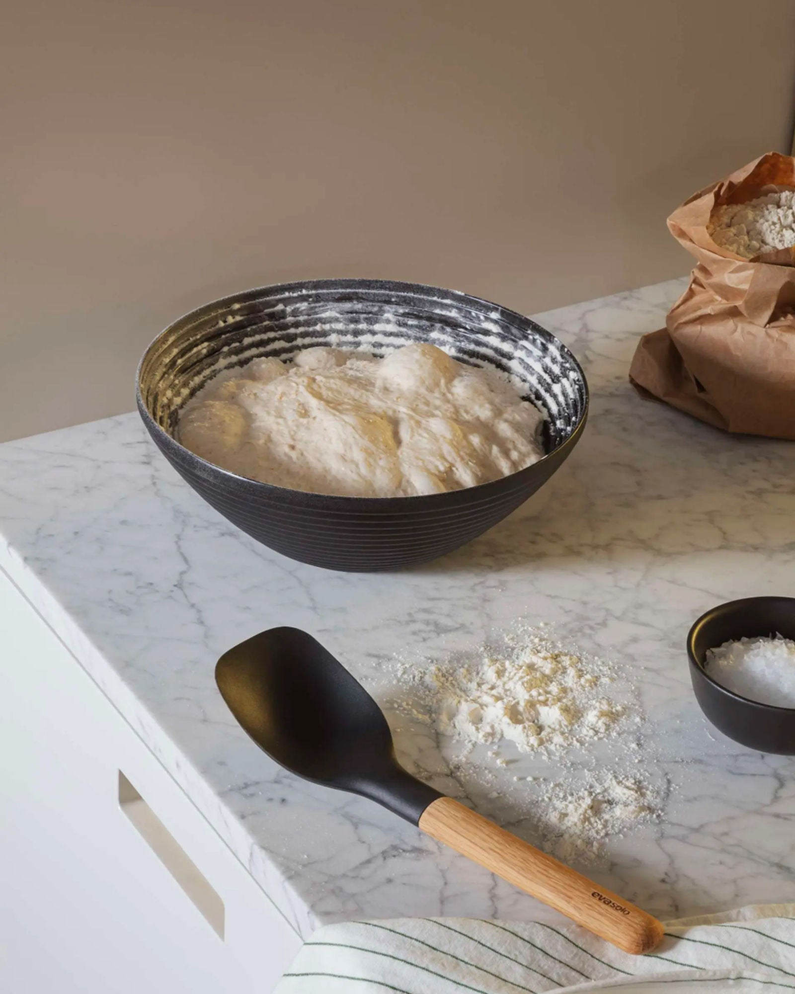 • يحتوي السطح الداخلي غير اللامع على نتوءات أو أخاديد تساعد على حبس الدقيق ودعم العجين أثناء ارتفاعه على الجوانب. وهذا يساعد على إعطاء شكل أفضل.