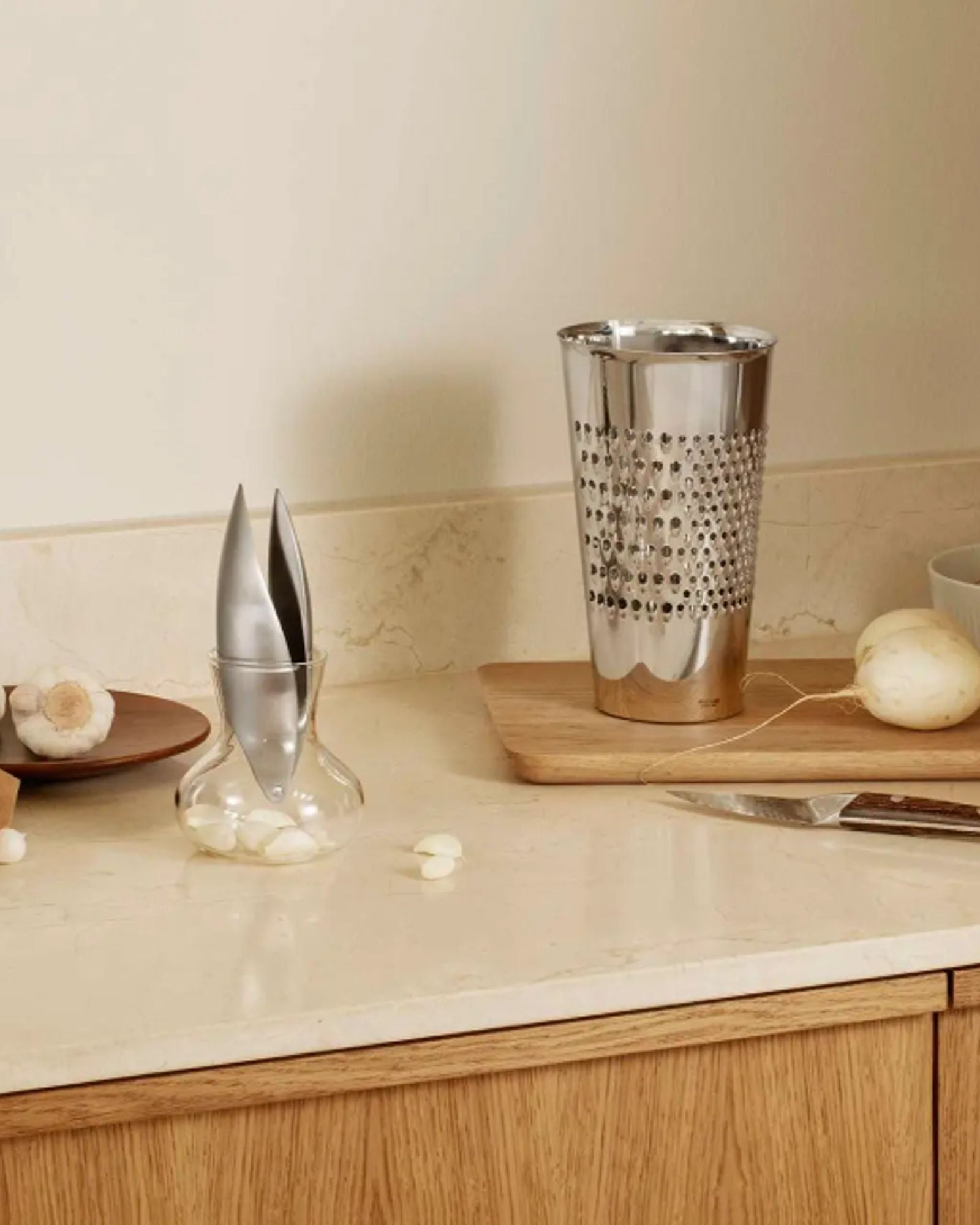 • يتساقط الطعام المبشور بشكل أنيق في الوعاء المدمج المصنوع من الفولاذ المقاوم للصدأ.