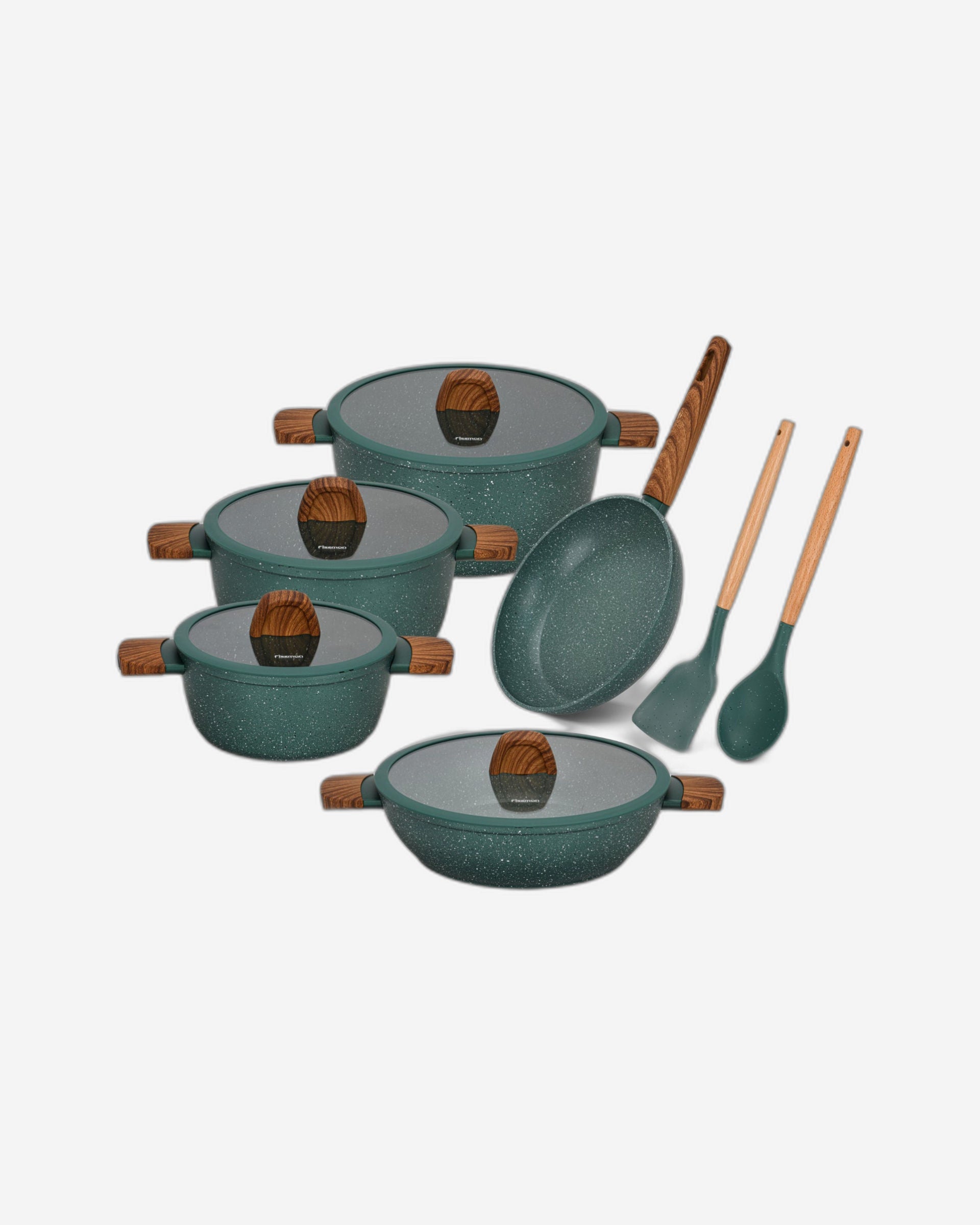 ارتقِ بتجربة الطهي لديك مع طقم أواني الطهي فيسمان المكون من 11 قطعة، تحفة فنية مصنوعة من ألومنيوم فلك عالي الجودة ومزينة بطبقة متينة غير لاصقة. صُممت هذه المجموعة الشاملة من أواني الطهي لتلبية جميع احتياجاتك في الطهي، مما يوفر حلاً متعدد الاستخدامات وأنيقًا لكل مطبخ.