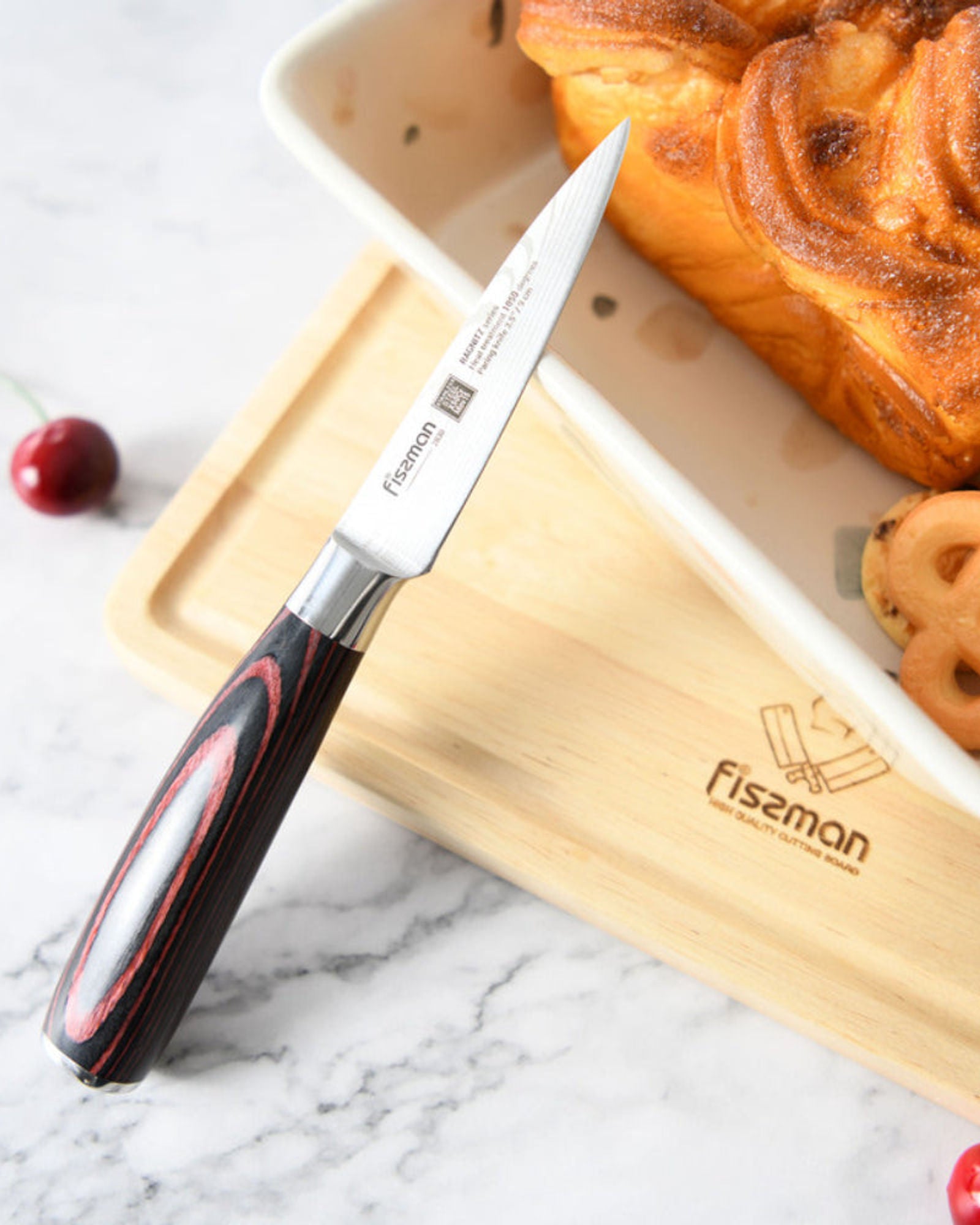 سكاكين المطبخ من سلسلة RAGNITZ مصنوعة من الفولاذ الألماني عالي السبائك X50Cr15MoV، والمُقسّى إلى 57 وحدة على مقياس روكويل. تتميز بمتانتها العالية ومناسبة للاستخدام المتكرر. تتميز الشفرات بشحذ متماثل على الوجهين على طول حافة القطع، مما يضمن سهولة القطع. مقابض Pakka مصممة بأناقة وتوفر قبضة محكمة. صُنعت باستخدام تقنية خاصة، وهي مريحة للغاية وعملية. بفضل هذا التصميم، تتميز السكاكين بتوازن مثالي وتناسب اليد بشكل جيد. هل ترغب في الحصول على رفيق موثوق به في تحضير وجبة إفطار سريعة، أو غداء دسم، أو عشاء فاخر؟ ستساعدك FISSMAN في تنفيذ أي أفكار! تعليمات الاستخدام • لإطالة عمر السكاكين، يجب غسلها يدويًا. في غسالة الأطباق، تتعرض السكاكين لمواد تنظيف قاسية وتغيرات كبيرة في درجات الحرارة. البيئة القاسية ستدمر الحافة الحادة للسكين، وبالتالي تقلل من عمرها الافتراضي. • لمنع تغير لون الشفرة، اغسل السكاكين فورًا بعد الاستخدام. لن تجف جزيئات الطعام على السكين، وسيكون تنظيفها أسهل. • لا يُنصح باستخدام سكاكين المطبخ على سطح صلب، مثل سطح منضدة حجري أو لوح زجاجي، لأن ذلك قد يُضعف حافة القطع قبل الأوان. استخدم ألواح تقطيع FISSMAN الخشبية أو البلاستيكية للقطع، فهي أقل بروزًا للشفرة. • استخدم حوامل FISSMAN الأصلية وأشرطة التثبيت المغناطيسية على الحائط لتخزين السكاكين، مما يُطيل عمرها الافتراضي. • للحفاظ على حدة الشفرة، استخدم أدوات وملحقات FISSMAN الخاصة (أدوات حادة، مبراة). • تعامل مع السكاكين بأيدٍ جافة فقط، وإلا فقد تُصاب بجروح من الشفرة. • يُرجى اتباع تعليمات العناية، وستدوم الأطباق لفترة طويلة. • يُلبي هذا المنتج جميع معايير السلامة والنظافة.