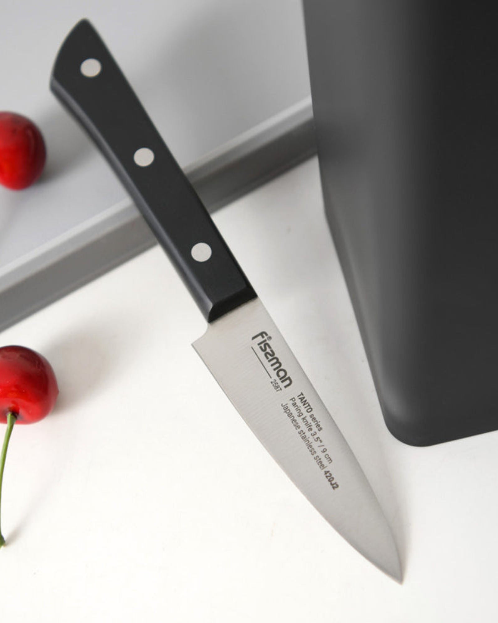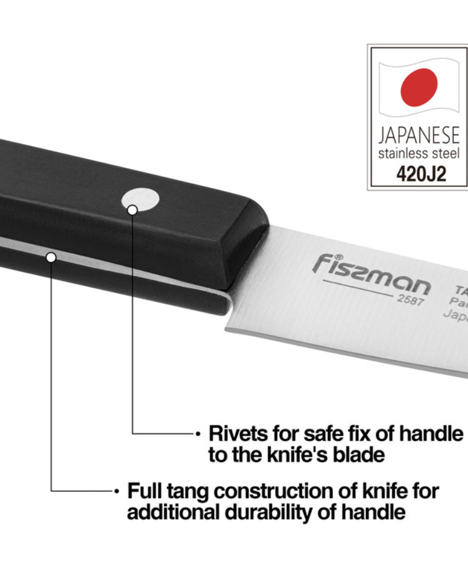 سكاكين المطبخ من سلسلة TANTO مصنوعة من الفولاذ الياباني عالي الجودة 420J2، المعروف بمتانته وصلابته ومقاومته الاستثنائية للتآكل. صُممت هذه السكاكين بدقة ومتانة، وتتميز بشحذ متماثل على كلا الجانبين على طول حافة القطع، مما يضمن تقطيعًا سهلًا. المقبض البلاستيكي ABS المريح مُثبّت بإحكام بثلاثة مسامير، مما يوفر قبضة مريحة وموثوقة لمهام المطبخ اليومية. للحفاظ على عمر افتراضي طويل وأداء ممتاز، يُنصح بغسلها يدويًا.